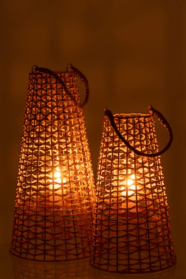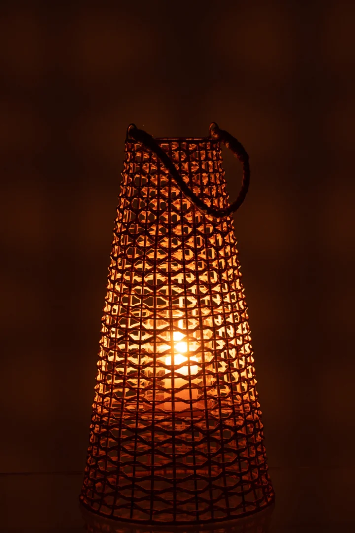 Plaats een stompkaars of LED-kaars in de glazen binnenhouder en geniet van warm, gefilterd licht dat mooi door het rotan speelt. Perfect naast de bank, in de hal of op een overdekte veranda. Past prachtig bij boho, coastal en Scandinavische interieurs.