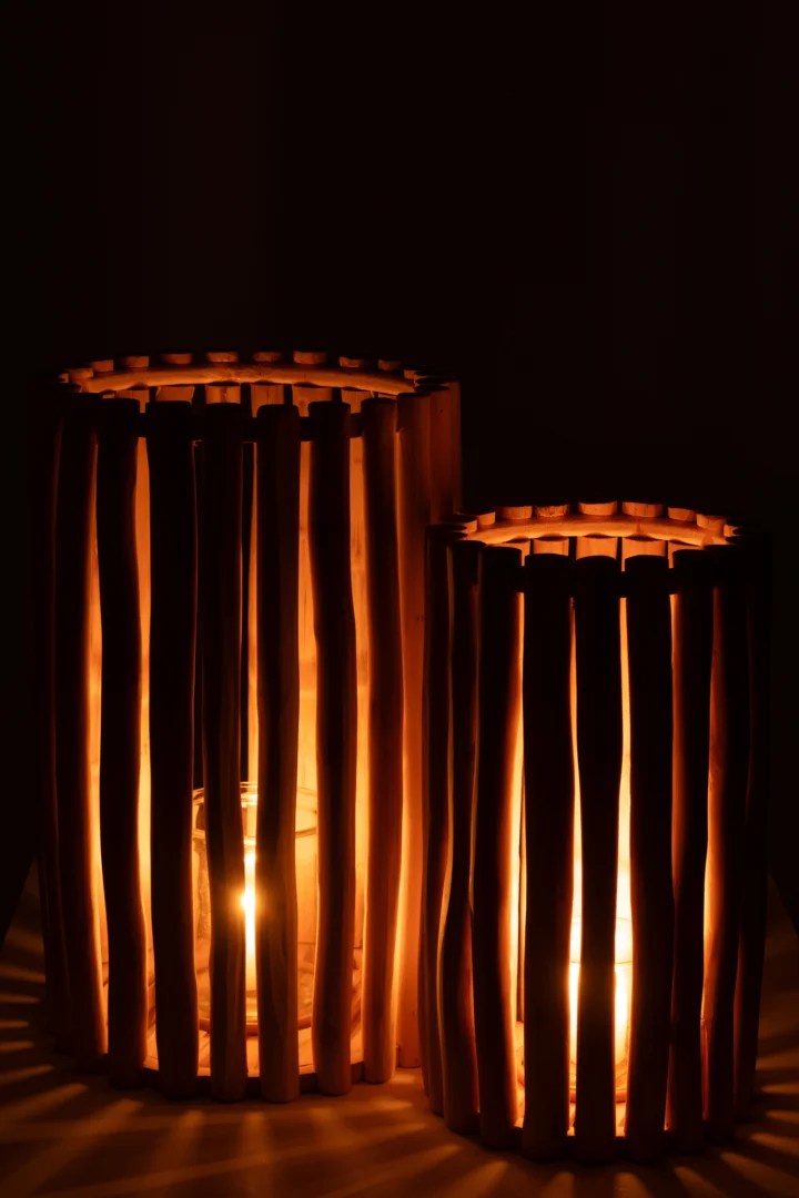 Kaarsenhouder Lantaarn Teak Natuurlijk Set 2