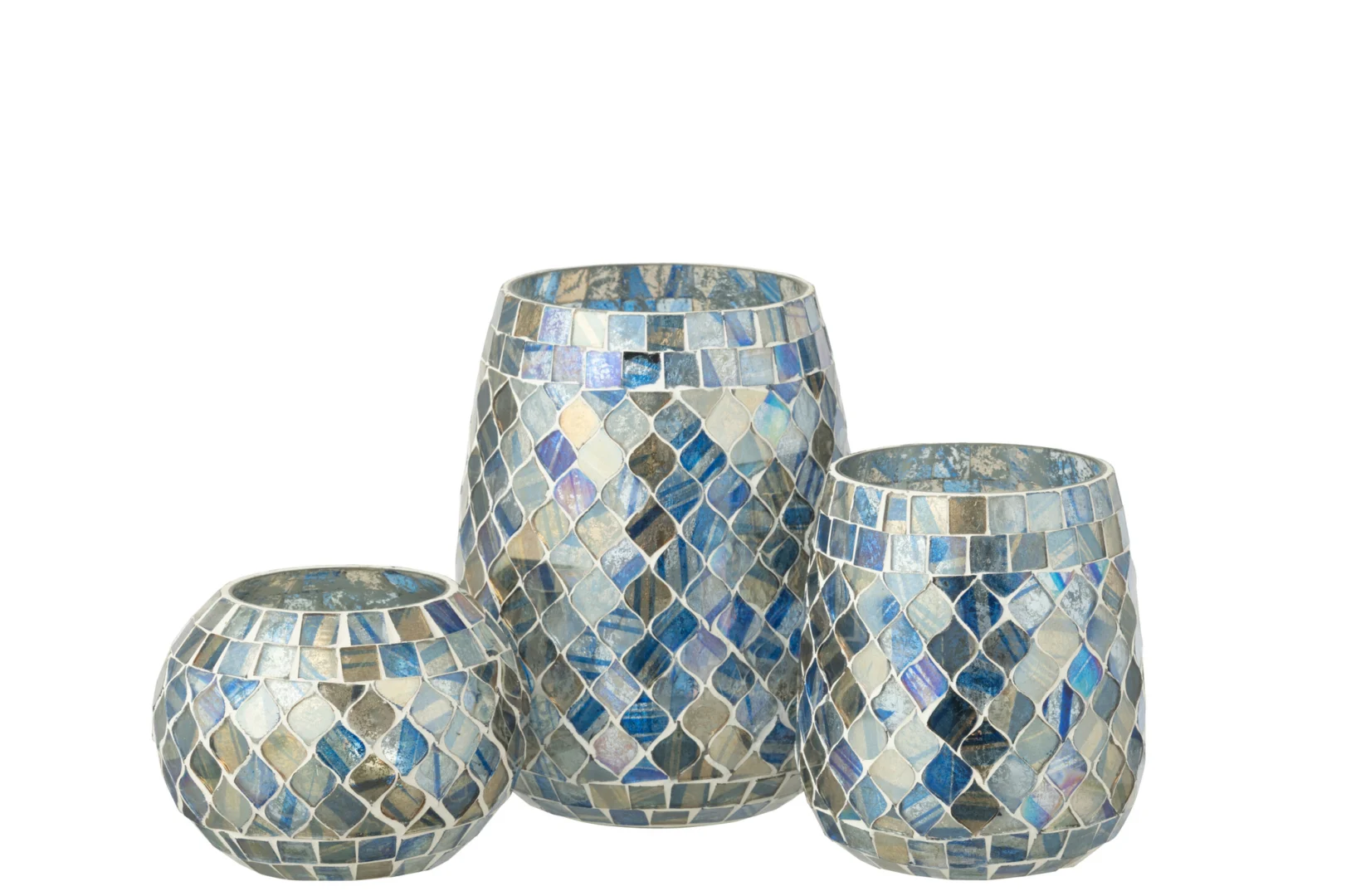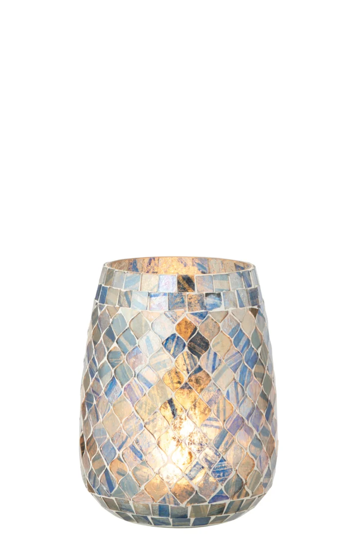Tijdens een winterdiner zorgt deze glazen kaarshouder voor een warme, sfeervolle gloed. Het mozaïekontwerp weerkaatst het licht prachtig en de blauwe tint past goed in een koel interieur. Door het gewicht is hij minder makkelijk te verplaatsen. Ideaal voor liefhebbers van seizoensdecoratie. Een stijlvolle keuze voor gezellige avonden.