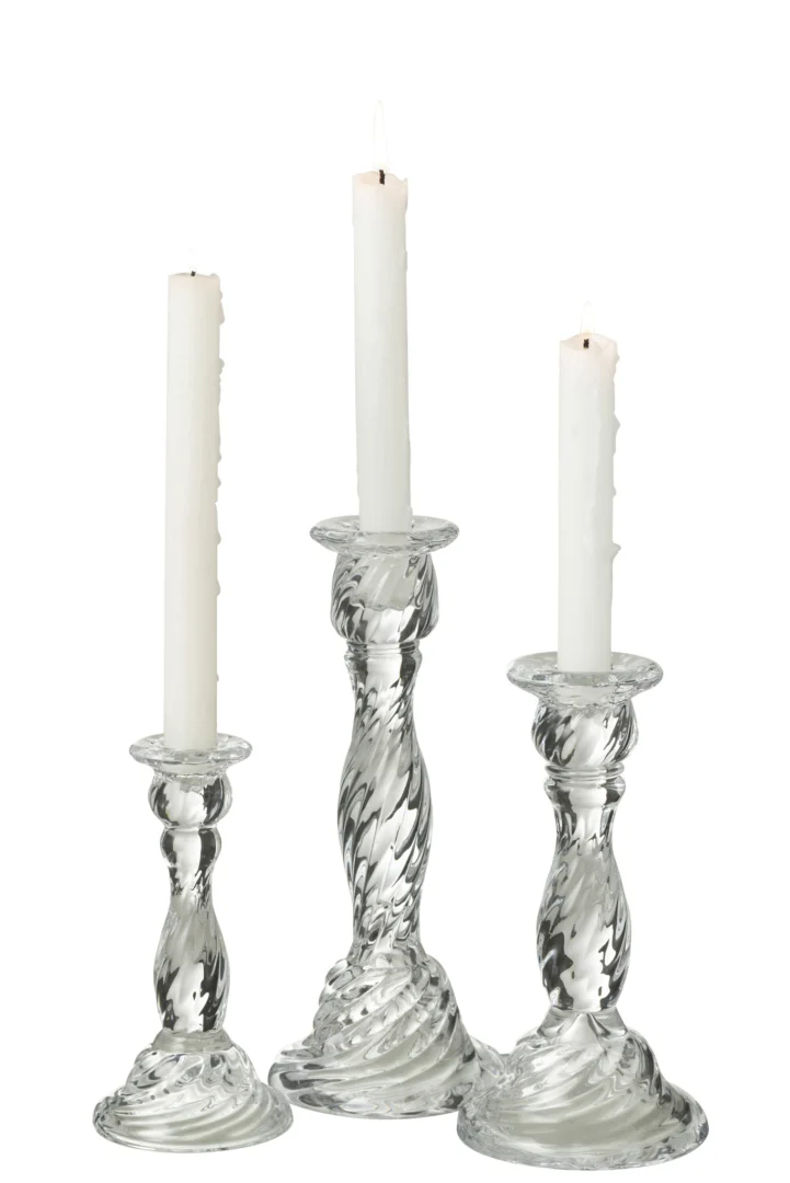 Materiaal en verzorging: volledig glas. Reinig met een zachte, droge of licht vochtige doek; vermijd schuurmiddelen. Plaats op een vlakke ondergrond en laat kaarsen nooit onbeheerd branden. Levering binnen 2-3 dagen.