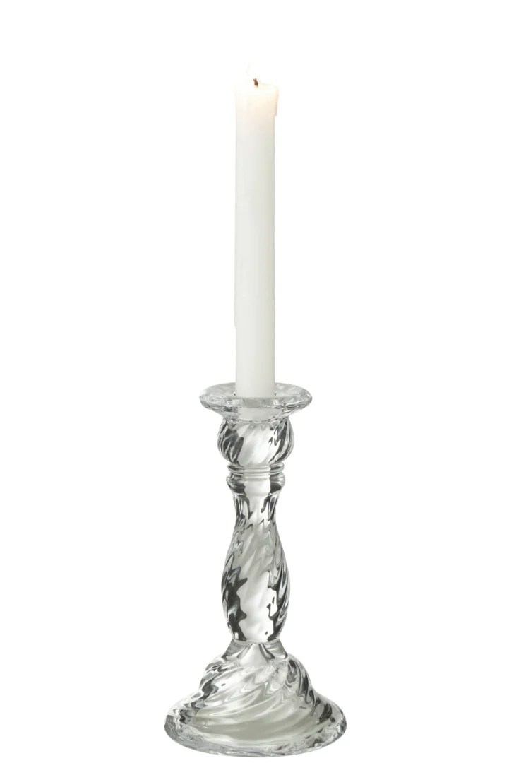 Kaarsenhouder Nono Glas Transparant Medium met een wervelende, gedraaide steel en ronde basis, afgebeeld tegen een effen witte achtergrond.