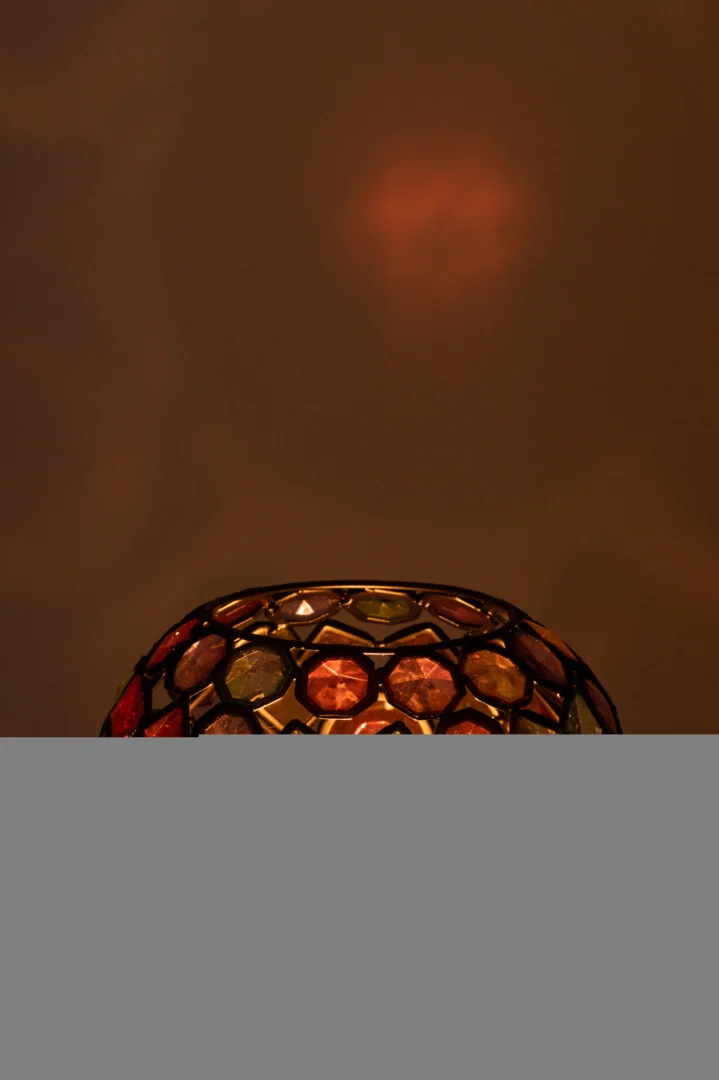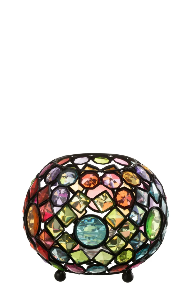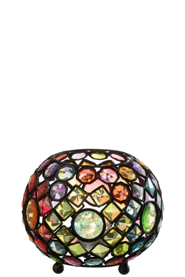 Creëer direct sfeer met deze ronde kaarsenhouder in orkaan-stijl. De gemengde kleurtinten en het metalen accent geven elke ruimte een warme, moderne uitstraling.