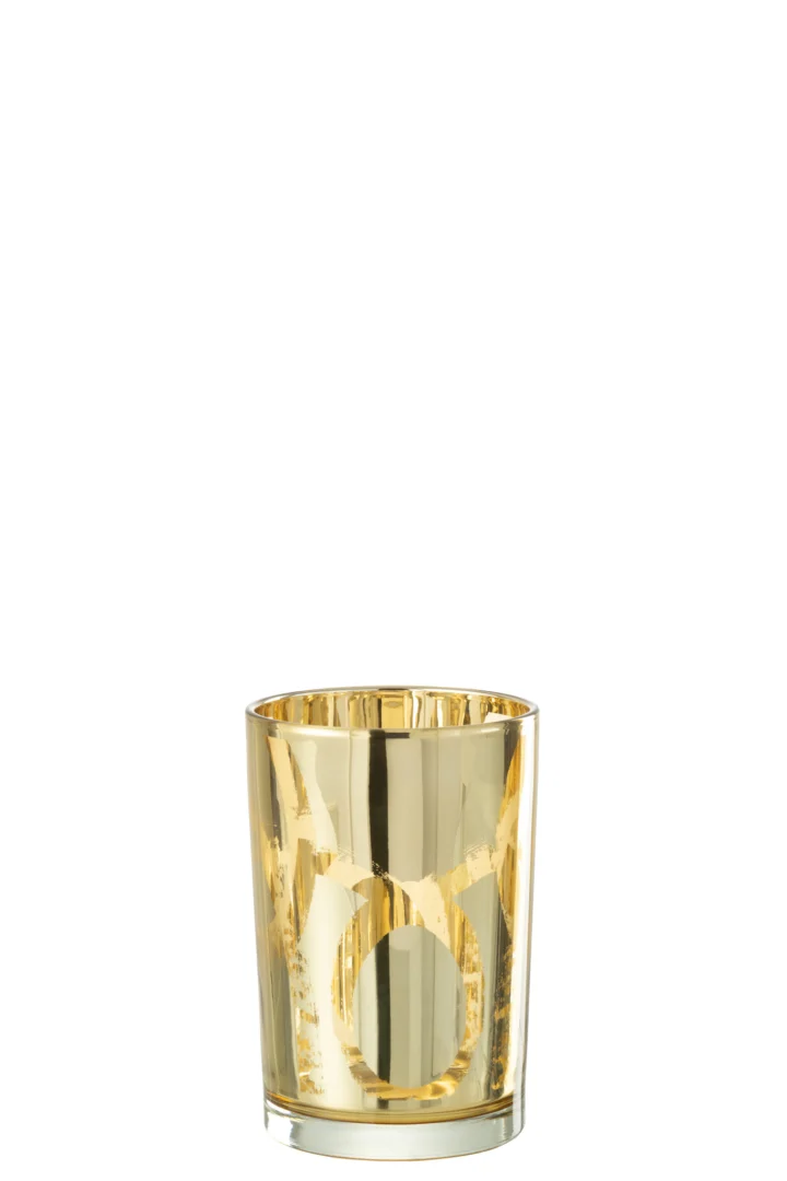 Breng een warme gloed in huis met deze stijlvolle glazen kaarsenhouder in een elegante goudtint. Het tijdloze design voegt direct sfeer toe aan tafel, dressoir of vensterbank.