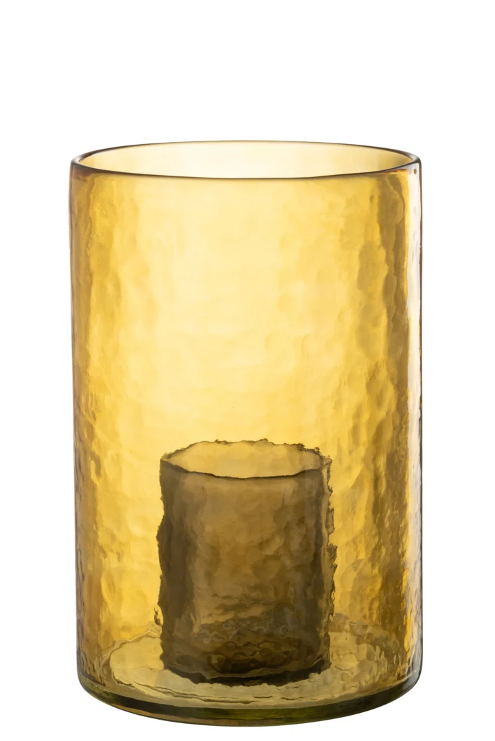 Deze glazen kaarsenhouder werd gebruikt als middelpunt op een eettafel tijdens een familiediner. De dubbele wand biedt stabiliteit en voorkomt oververhitting, terwijl de gele kleur warmte toevoegt. Door het formaat is hij lastig op kleinere oppervlakken. Geschikt voor liefhebbers van opvallende woonaccessoires. Een degelijke keuze voor sfeerzoekers.