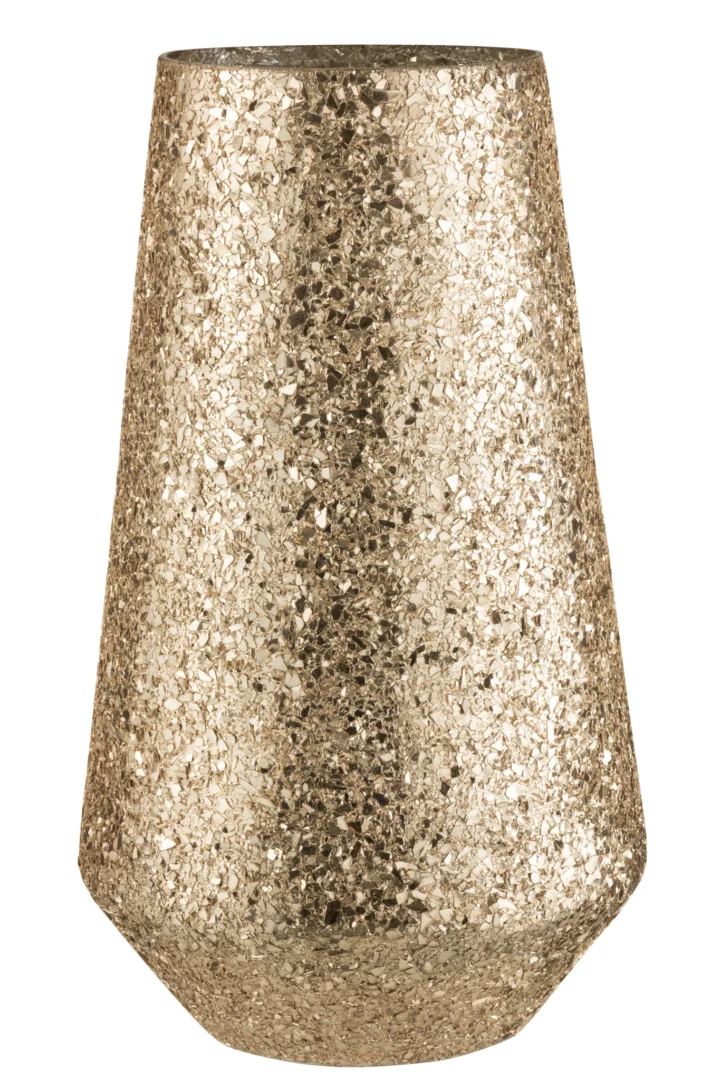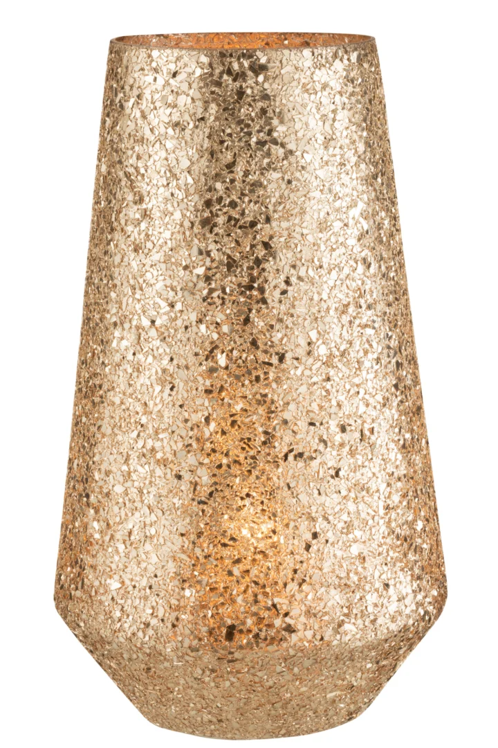 Stabiele glazen kaarsenhouder met warm goudeffect; opvallend formaat, maar lastig te combineren in kleinere ruimtes. Geschikt voor sfeervolle interieurs.