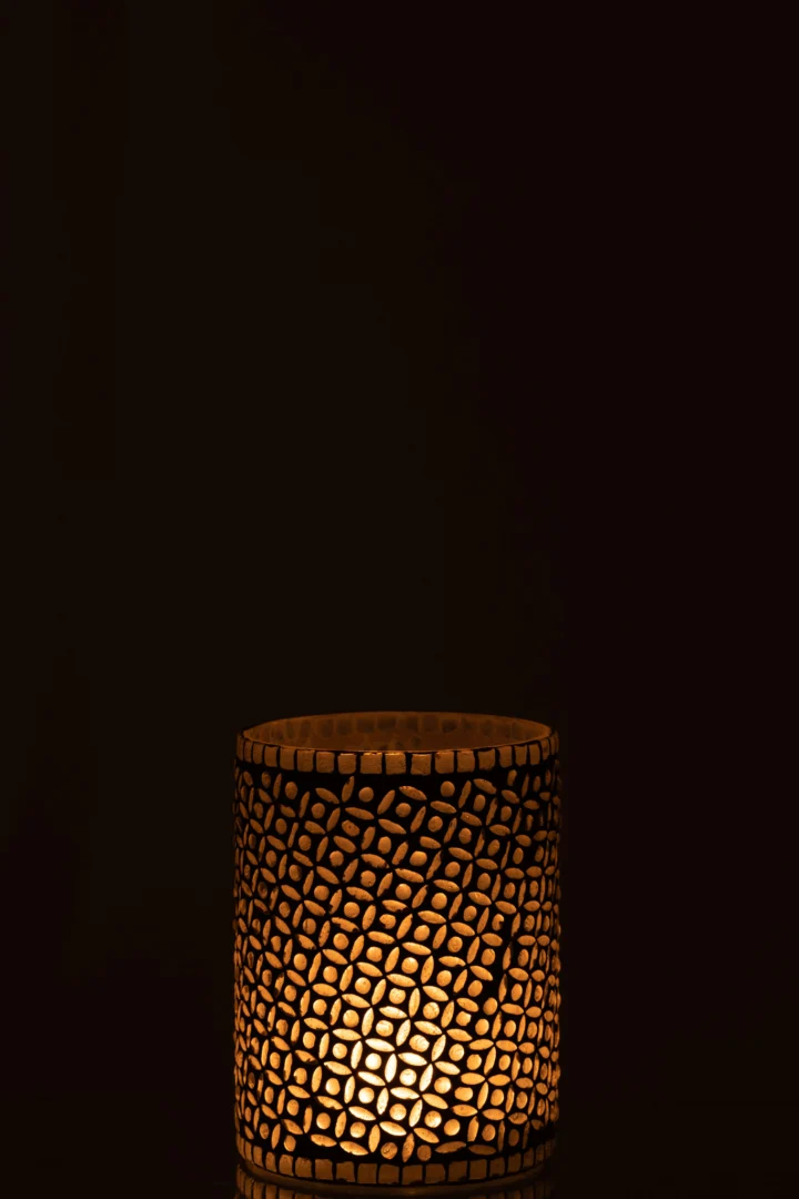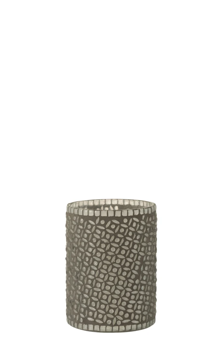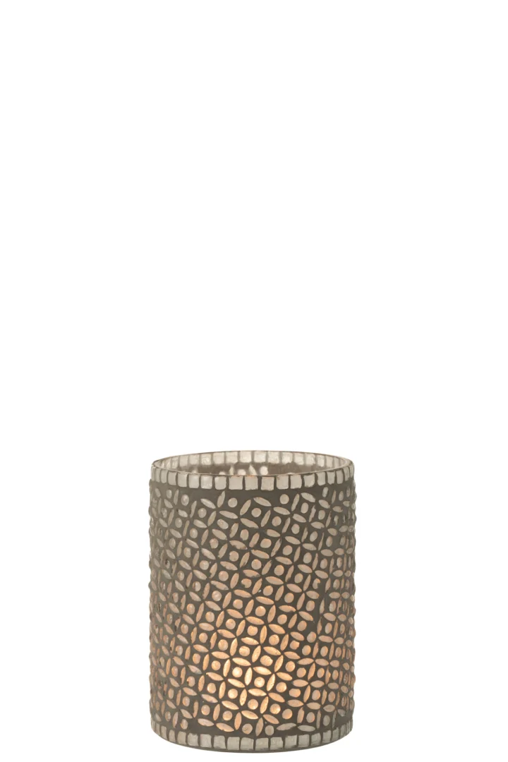Met de lichtgrijs mozaïek glas kaarsenhouder creëer je een verfijnde uitstraling die je ruimte transformeert. Dit unieke ontwerp reflecteert het kaarslicht op een betoverende manier, waardoor een warme ambiance ontstaat. Ideaal voor gezellige avonden of als opvallend decoratiestuk op tafel.