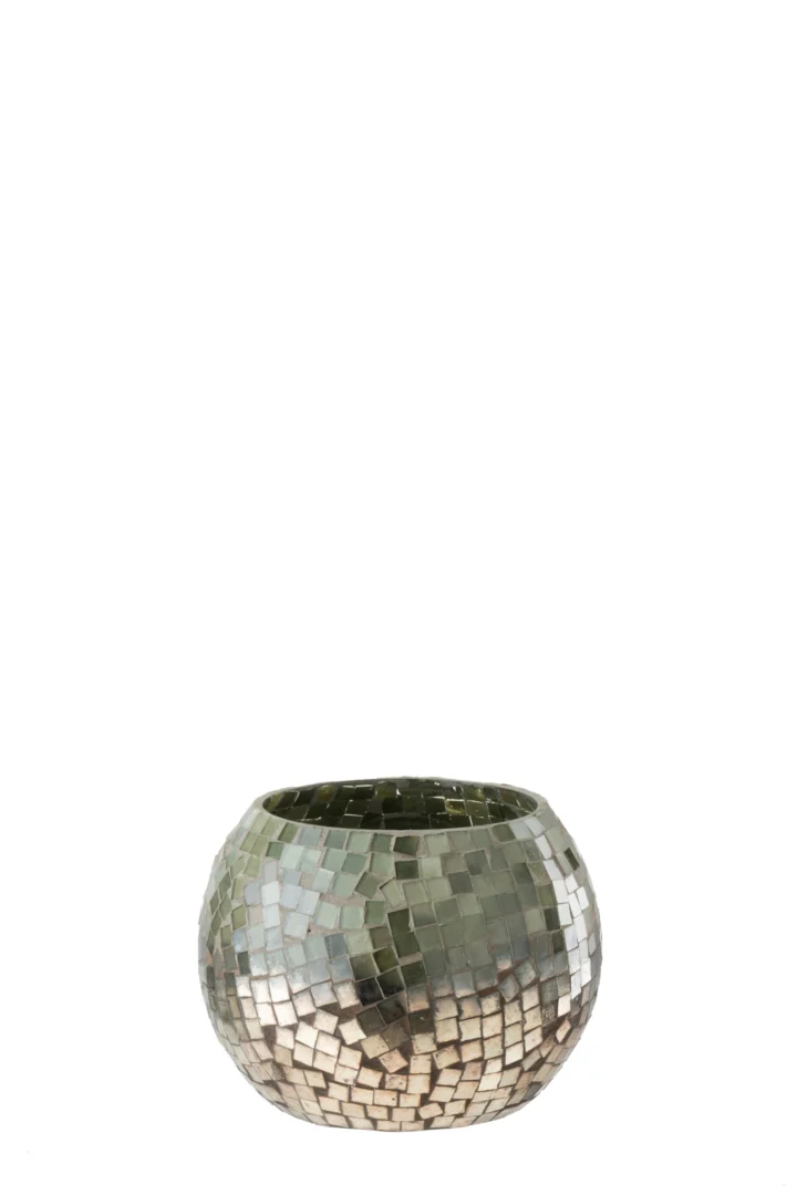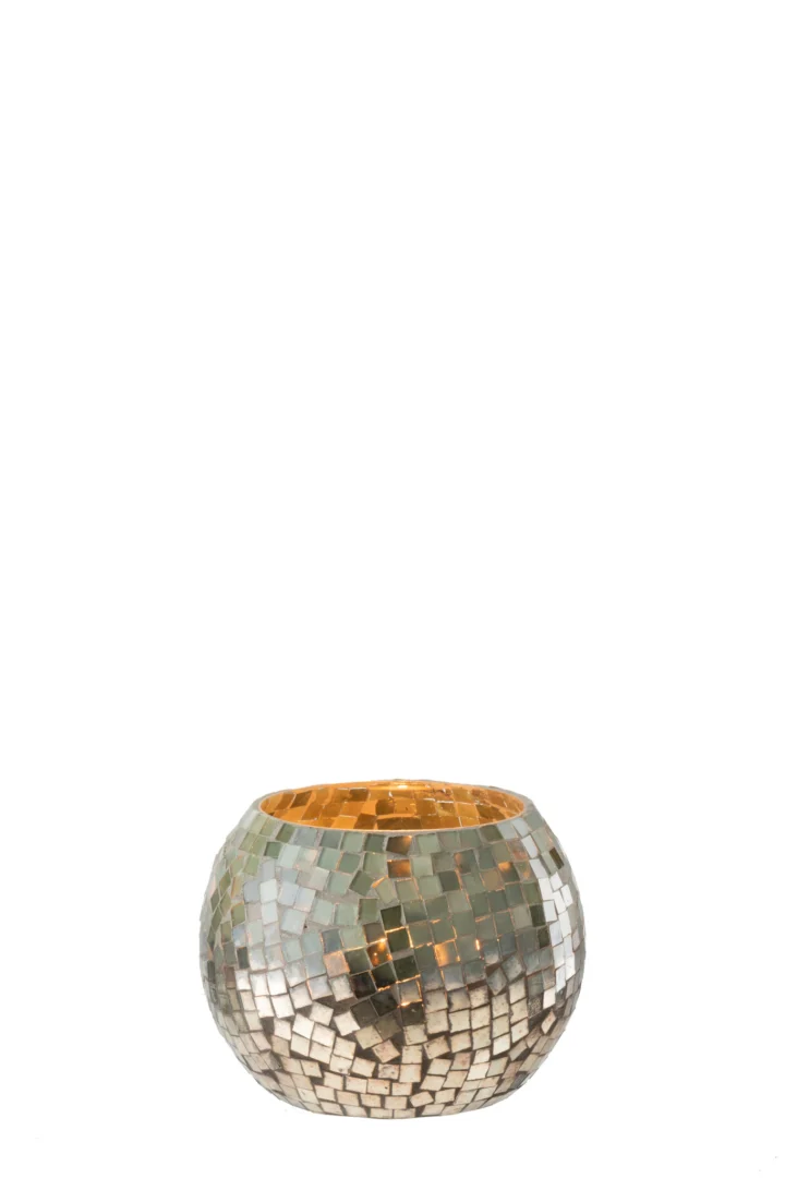 Deze theelichthouder mozaiek glas zilver voegt een speelse uitstraling toe, terwijl het zachte licht een warme sfeer creëert. Perfect voor op tafel, de vensterbank of een schoorsteenmantel, het ontwerp past naadloos in zowel moderne als klassiekere interieurstijlen. Laat je huis stralen met deze unieke toevoeging aan je decor.