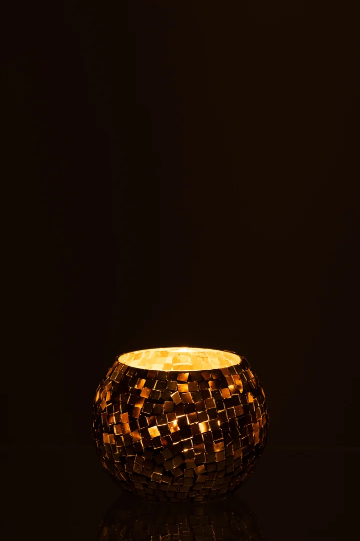 Tijdens een diner bij kaarslicht creëerde deze kleine glazen kaarsenhouder direct een warme, intieme sfeer. Het mozaïekpatroon verspreidt het kaarslicht mooi en het compacte formaat past overal. Minder geschikt voor grote kaarsen. Ideaal voor sfeergevoelige interieurs. Een stijlvolle toevoeging.
