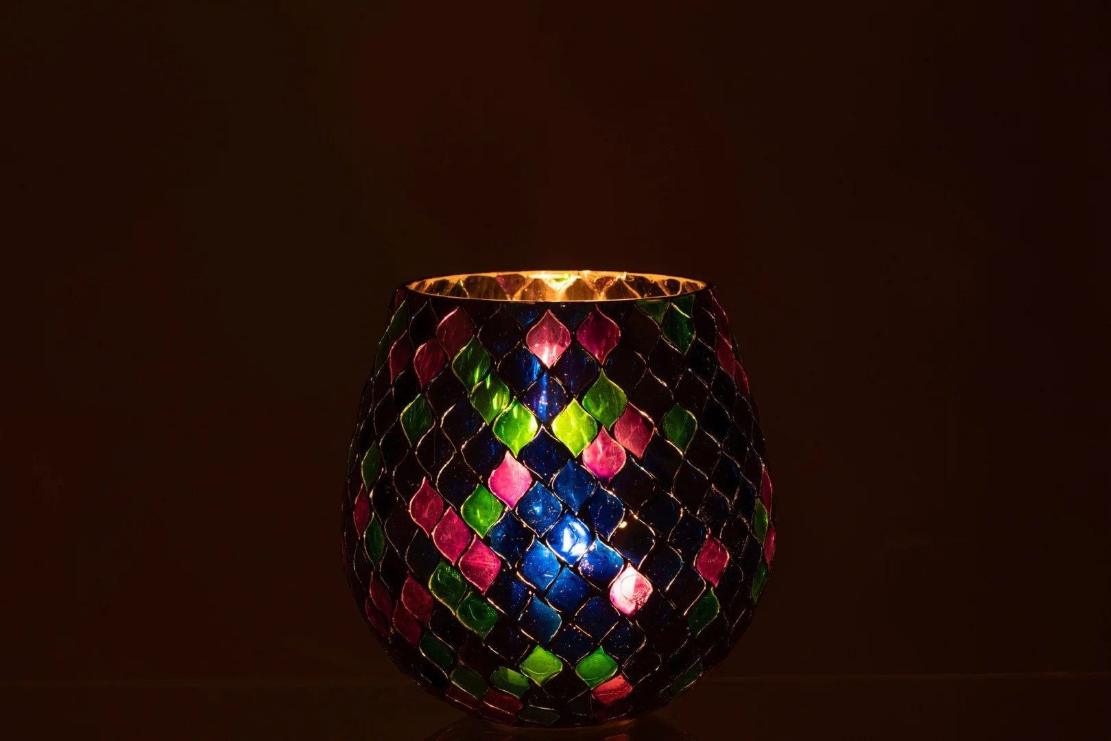 De Kaarsenhouder Orkaan Mozaïek Glas Paars Groot is een ronde glazen kandelaar met iriserende, ruitvormige mozaïektegeltjes in blauw, groen en paars op een witte achtergrond.