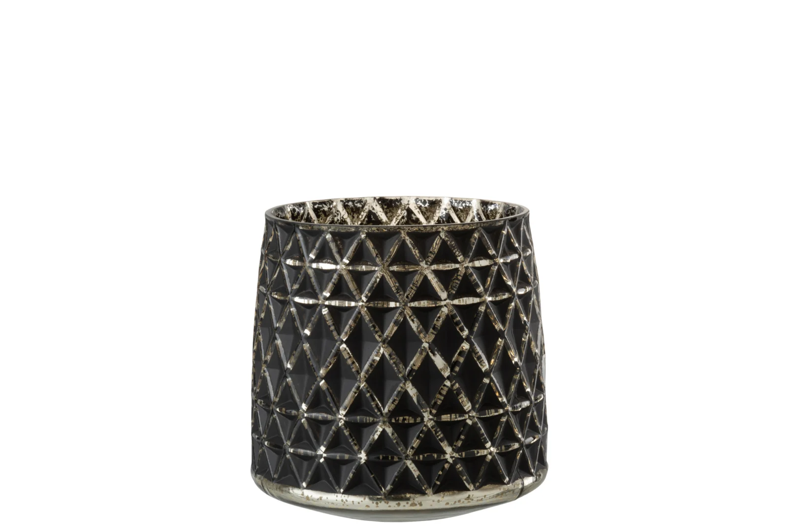 Zwarte glazen kaarsenhouder met gouden accenten, klein maar stijlvol detail.