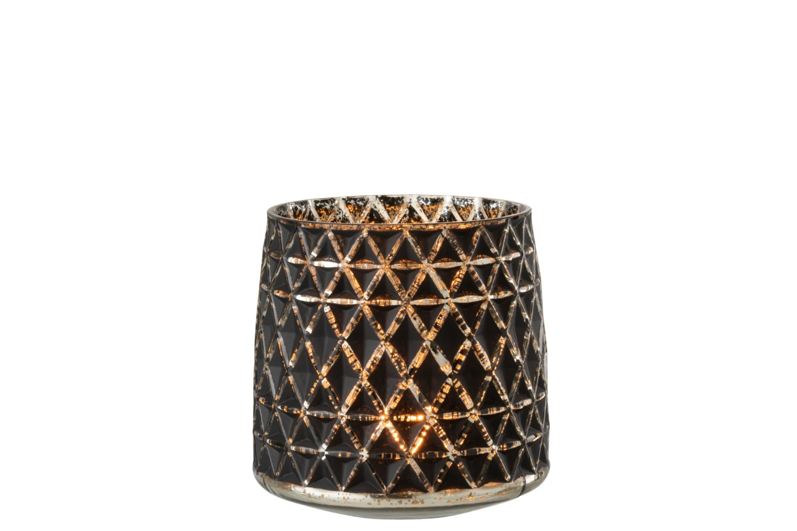 Zet hem solo neer voor een rustige, chique look of groepeer meerdere houders voor extra sfeer tijdens etentjes, feestdagen of gezellige avonden. Het donkere glas tempert het licht op een zachte manier, waardoor een warm, uitnodigend effect ontstaat.