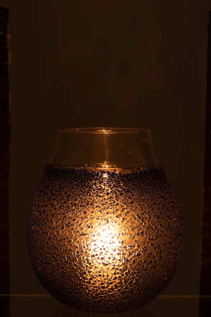 De glazen wand verzacht de vlam en zorgt voor een knusse, sfeervolle gloed tijdens etentjes, me-time of gezellige avonden. Dankzij het stevige gewicht blijft hij stabiel, ook op een overdekt terras. Combineer met andere blauwe accenten voor een harmonieuze look of mix met naturel tinten voor een fris contrast.