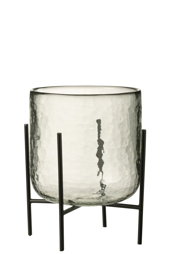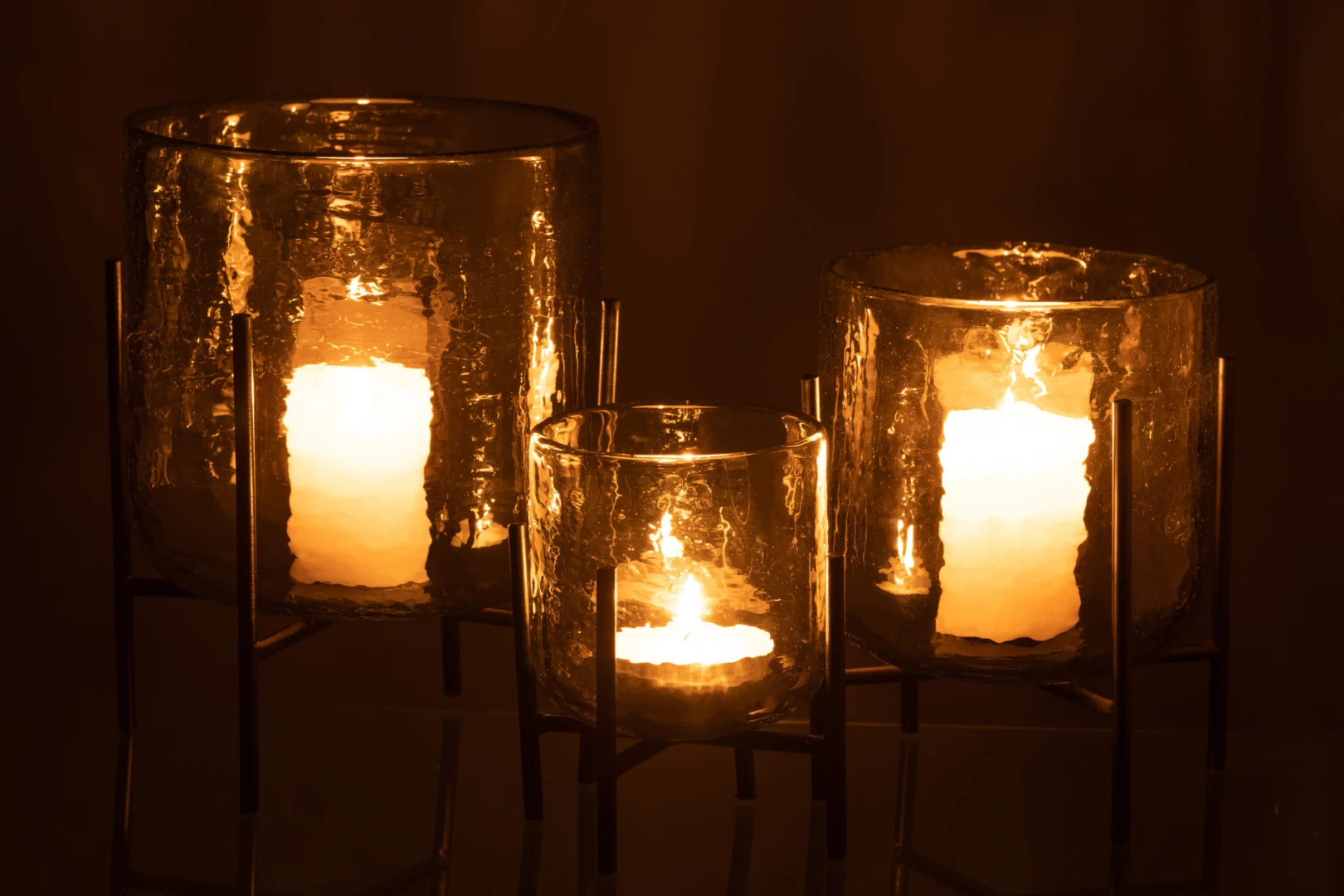Deze glazen kaarsenhouder staat stevig op tafel tijdens een zomeravond buiten. De combinatie van glas en ijzer oogt stijlvol en voelt robuust aan. Minder praktisch is het schoonmaken van de binnenkant. Geschikt voor liefhebbers van sfeervolle, moderne accenten. Aanrader bij passend interieur.