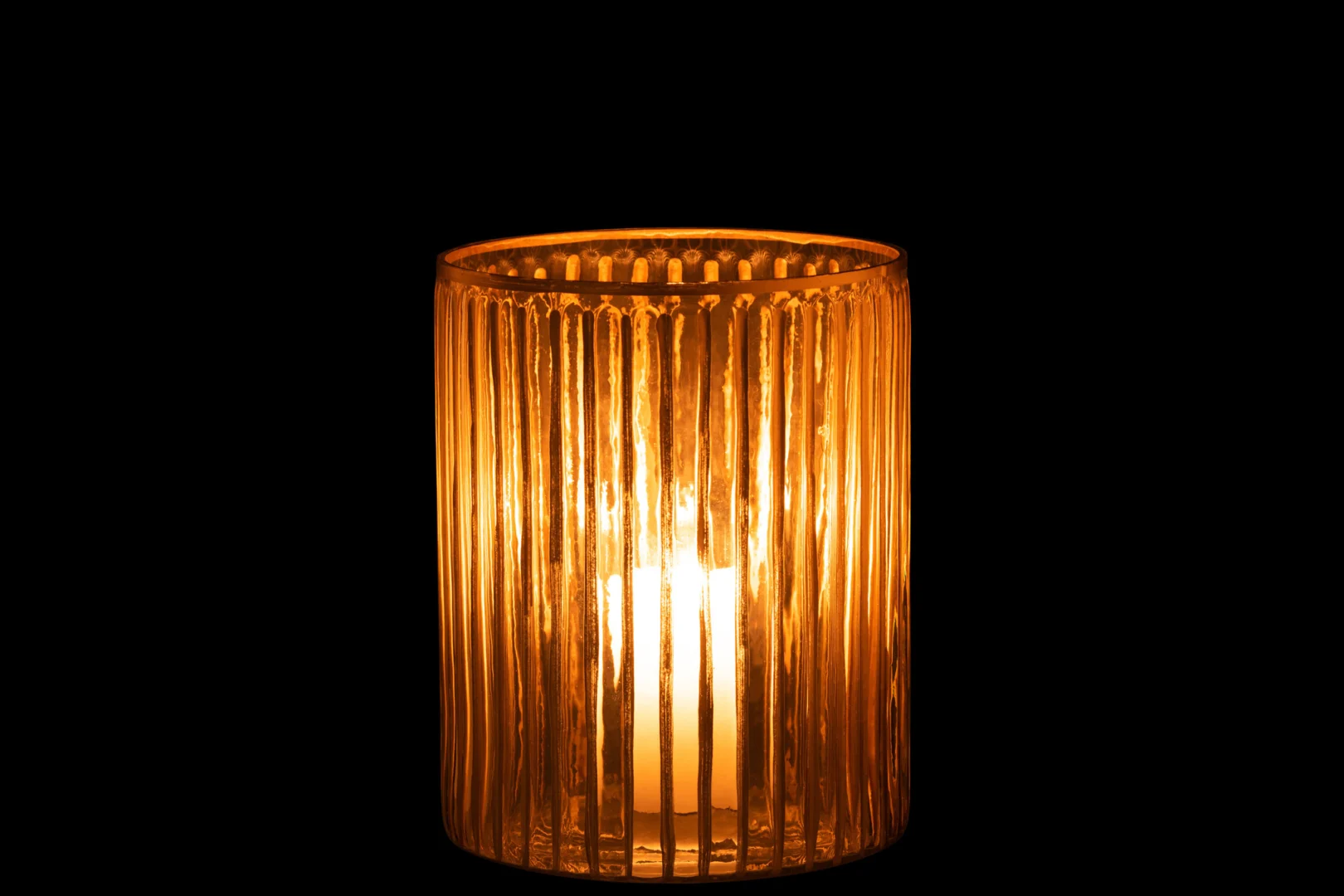 Tijdens een diner op een herfstige avond verspreidt deze glazen kaarsenhouder een warme gloed. Het stevige glas en de goudtint zorgen voor een luxe uitstraling. Door het formaat wat lastig op smalle oppervlakken. Ideaal voor sfeervolle woonkamers. Doordachte keuze voor decoratieve verlichting.