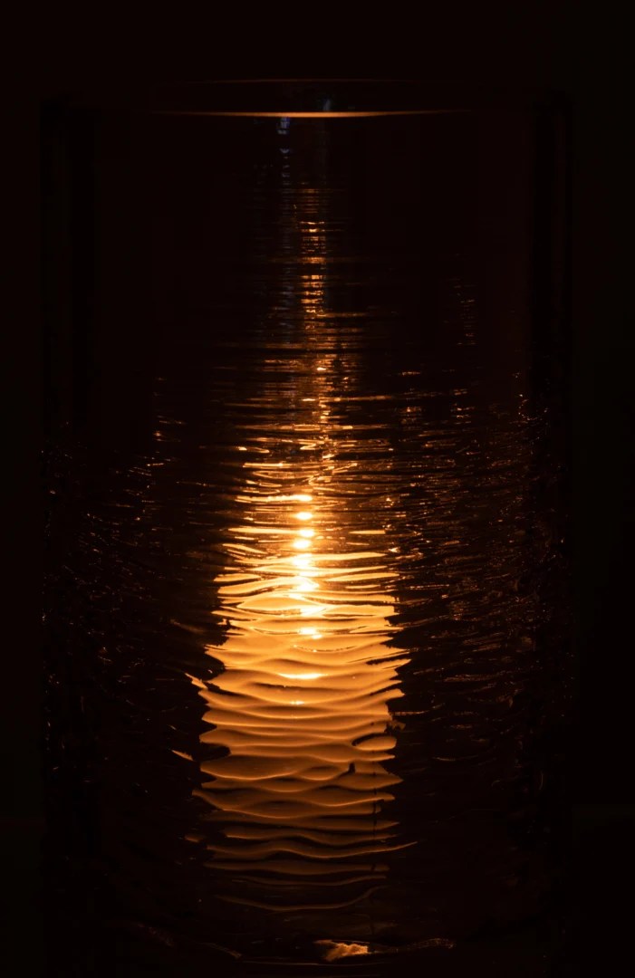 Breng direct sfeer in huis met deze grote hurricane kaarsenhouder van J-Line in stijlvol grijs/greige. Het zeeglas-effect verzacht het kaarslicht en zorgt voor een warme, rustgevende gloed op elke plek in je interieur.