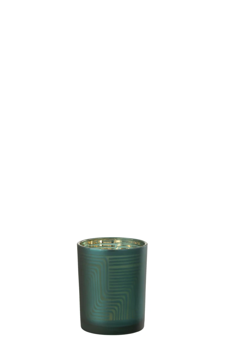 Ontdek sfeervol groen glas voor vensterbank of salontafel; klein formaat 10 bij 10 centimeter, hoogte 12,5 centimeter, materiaal glas (100%), onderdeel Hiver 2023, merk J-Line. Weegt 0,54 kg; ideaal voor theelichtjes en warme, subtiele verlichting.
