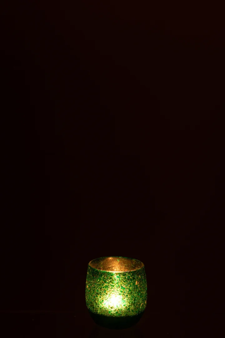 Verfraai je interieur met een compact glazen houder van J-Line (Hiver 2023). 9 bij 9 bij 9 centimeter, 80% glas/20% karton, 195 g; verspreidt warm licht van een theelicht of kleine stompkaars. Sfeervol als tafeldecoratie, vensterbank- of nachtkastaccent in groen.