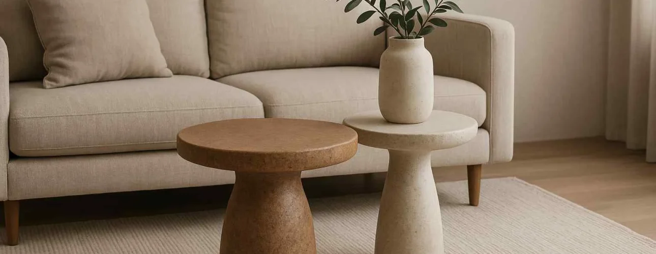 Voor wie liever kiest voor een warmere uitstraling, zijn keramische bijzettafels in beige of taupe een uitstekende keuze. Deze tinten brengen rust en natuurlijke harmonie, ideaal voor Scandinavische of bohemien interieurs.