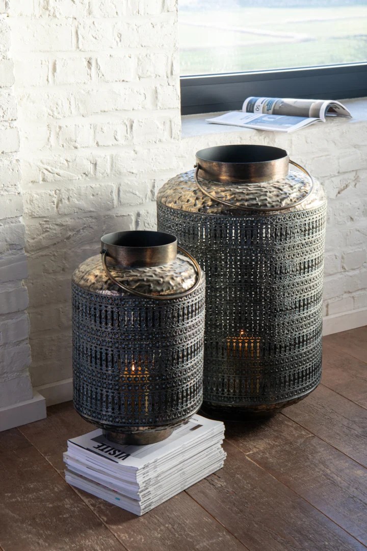 De Lantaarn Cilinder Antiek IJzer Brons Groot is een metalen lantaarn met een cilindrisch, gestructureerd lichaam, gedetailleerde uitgesneden patronen, een ronde bovengreep en een antieke rustieke afwerking in brons en blauwgroene tinten.