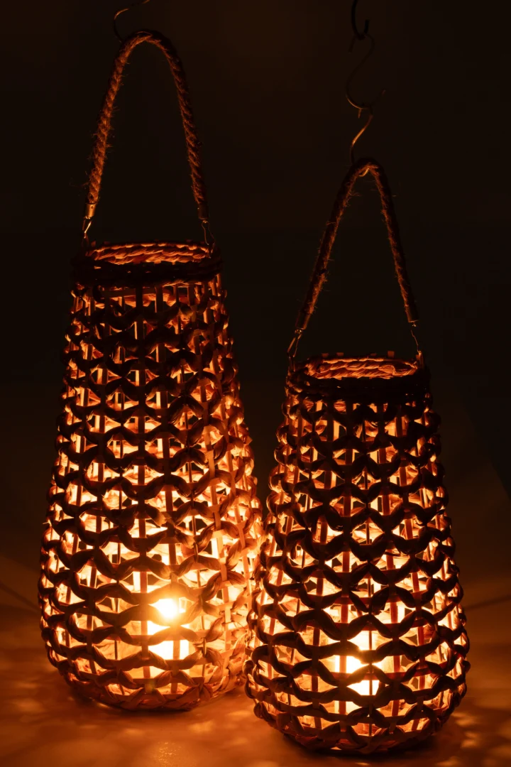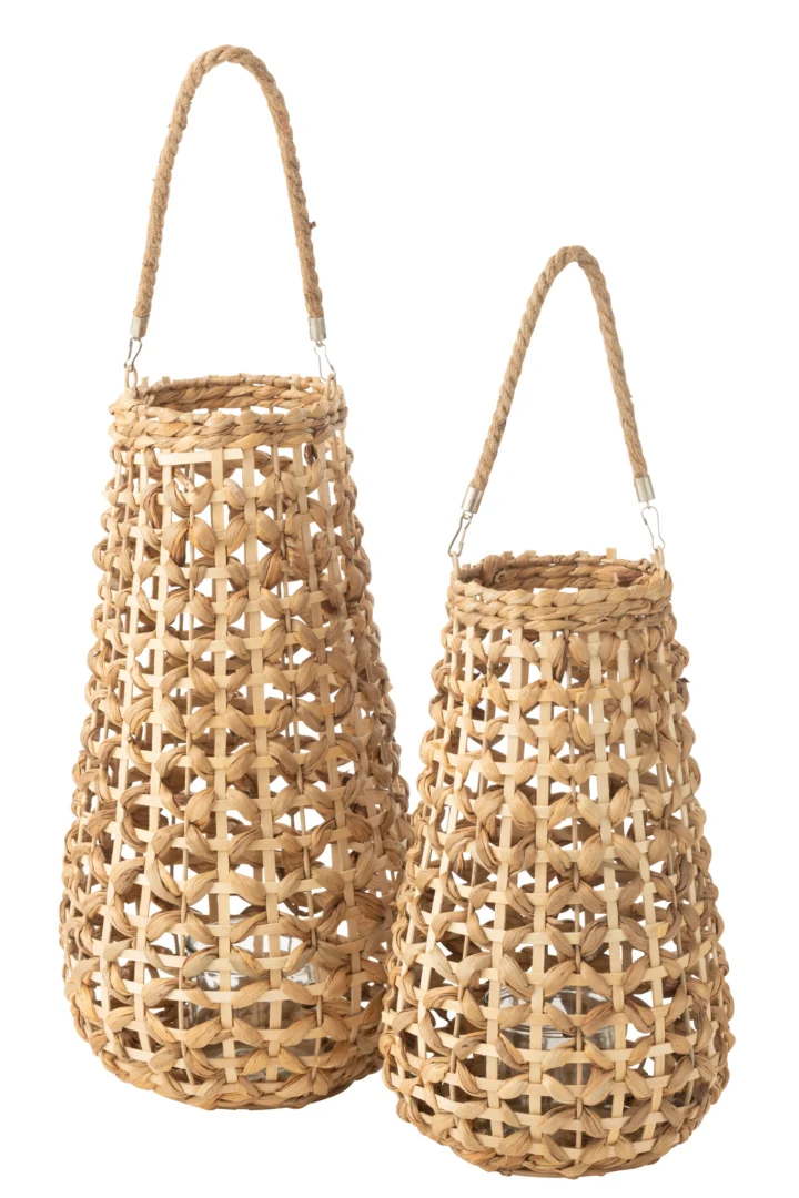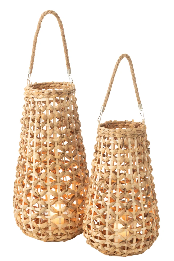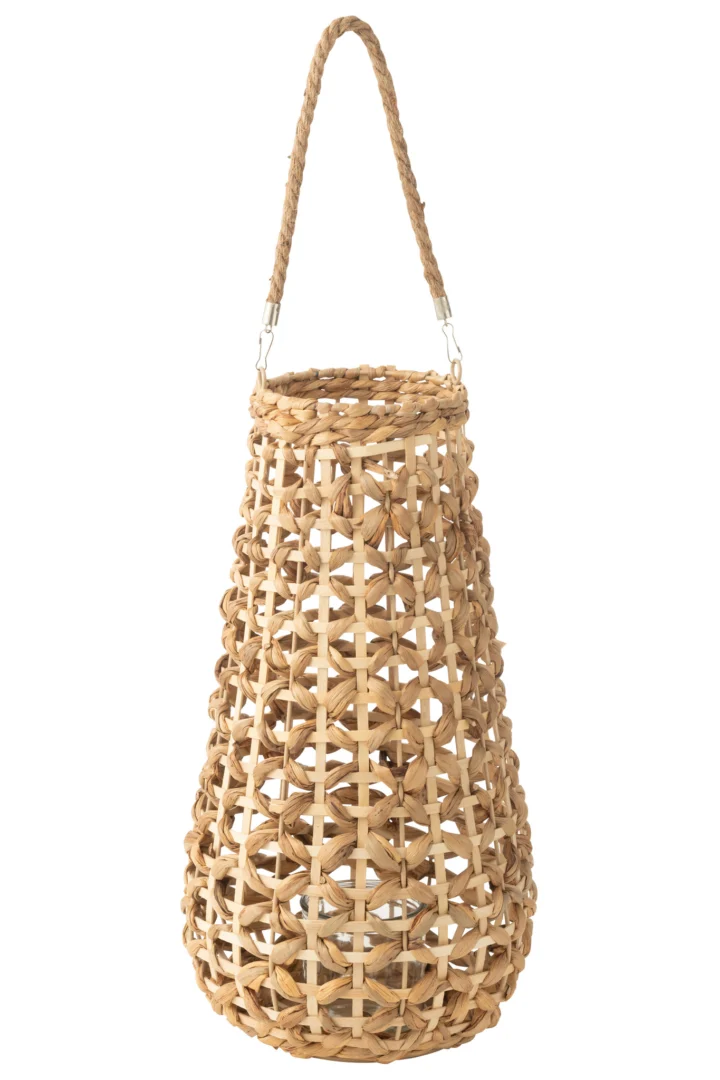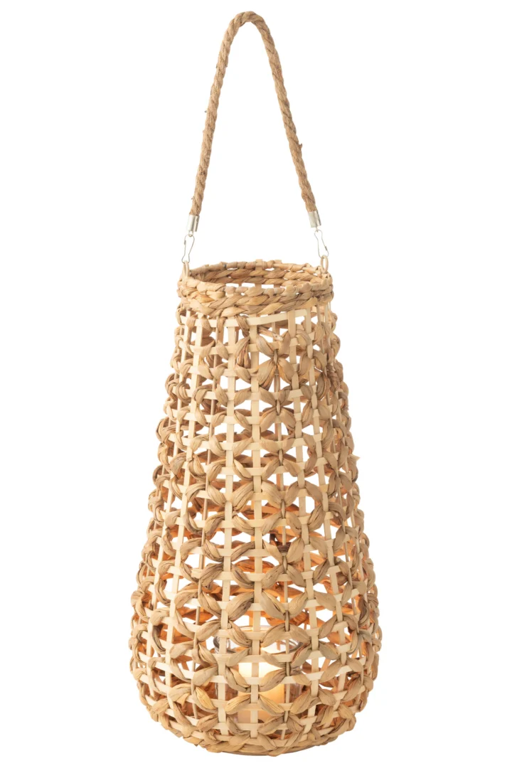 Tijdens een etentje op het terras zorgt deze hoge kaarsenhouder voor een warme, natuurlijke gloed. Het handgevlochten waterhyacint geeft een rustieke uitstraling, terwijl het ijzeren frame stevigheid biedt. Minder geschikt bij harde wind. Ideaal voor liefhebbers van natuurlijke materialen. Prima keuze voor sfeermakers.