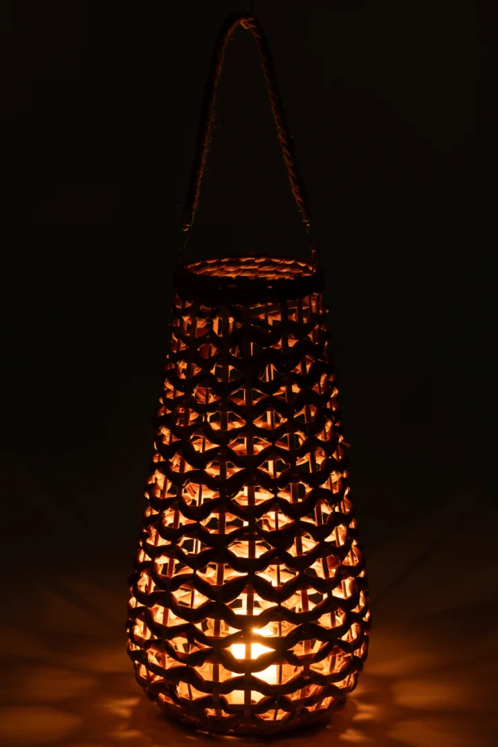 Deze hoge kaarsenhouder staat sfeervol in een hoek van de woonkamer tijdens donkere avonden. Het handgevlochten natuurlijke materiaal oogt warm en decoratief. Door het formaat is hij wat lastig te verplaatsen. Geschikt voor liefhebbers van rustieke woonaccessoires.