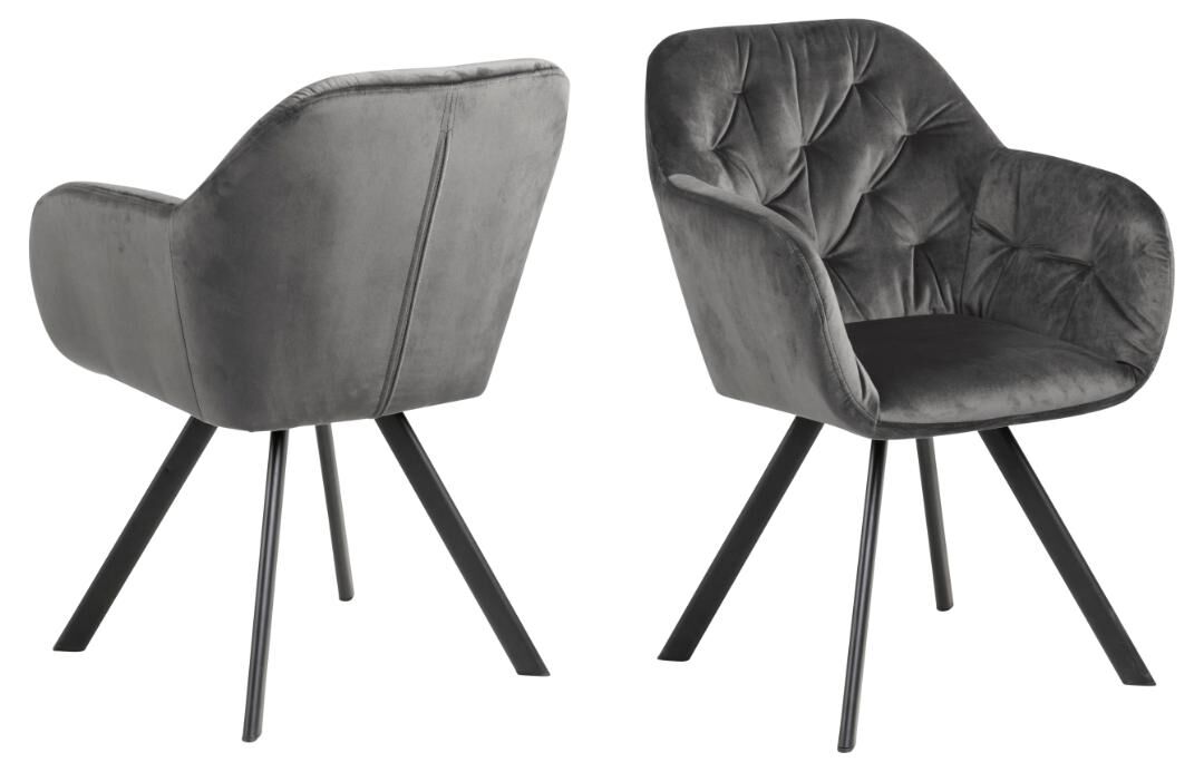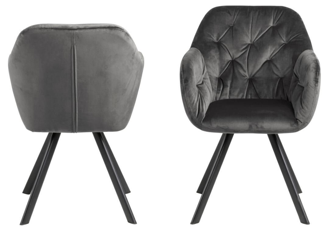 Ondersteunende rondingen, een solide stalen basis en een zachte zitting in donkergrijze Vic‑stof — gemaakt om nog even te blijven zitten.