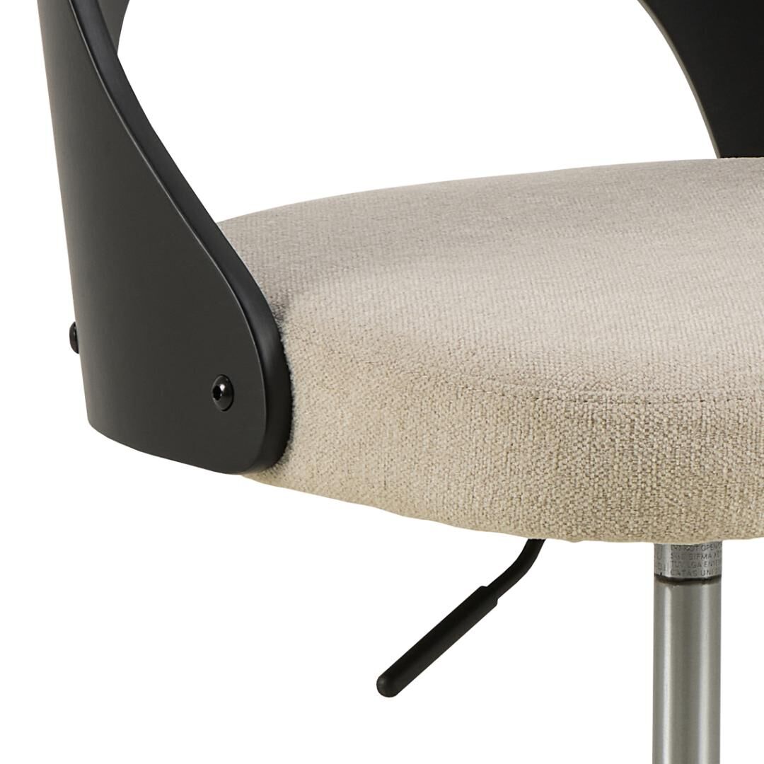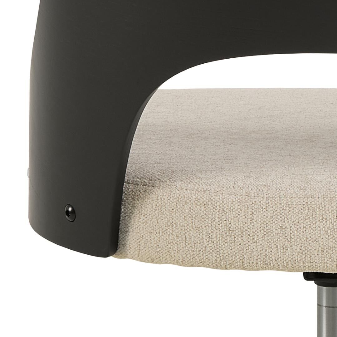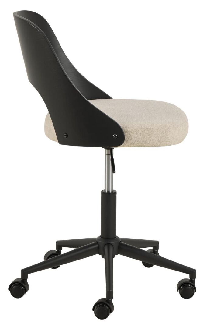 Je zit rechtop en toch ontspannen; de contouren ondersteunen zonder te dwingen. Draai eenvoudig aan of uit zonder te schuiven, terwijl het frame bij elke beweging solide aanvoelt. De mix van beige textiel en zwarte accenten matcht moeiteloos met moderne én klassieke tafels.