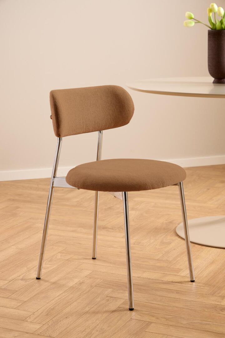 Ondersteunende rondingen, chroomglans en terracotta textuur die meteen uitnodigt. Een zijstoel met retro-futuristische flair én dagelijkse zitkwaliteit.