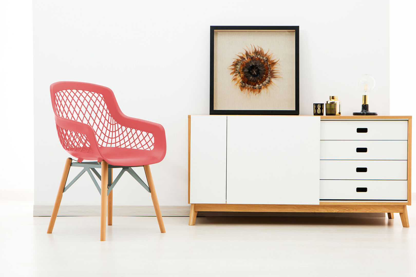 Strakke lijnen. Eerlijke materialen. Moeiteloze zit aan tafel. Deze eetkamerstoel met rode zitschaal en massieve houten poten voelt stevig, licht en uitnodigend—dag in, dag uit.