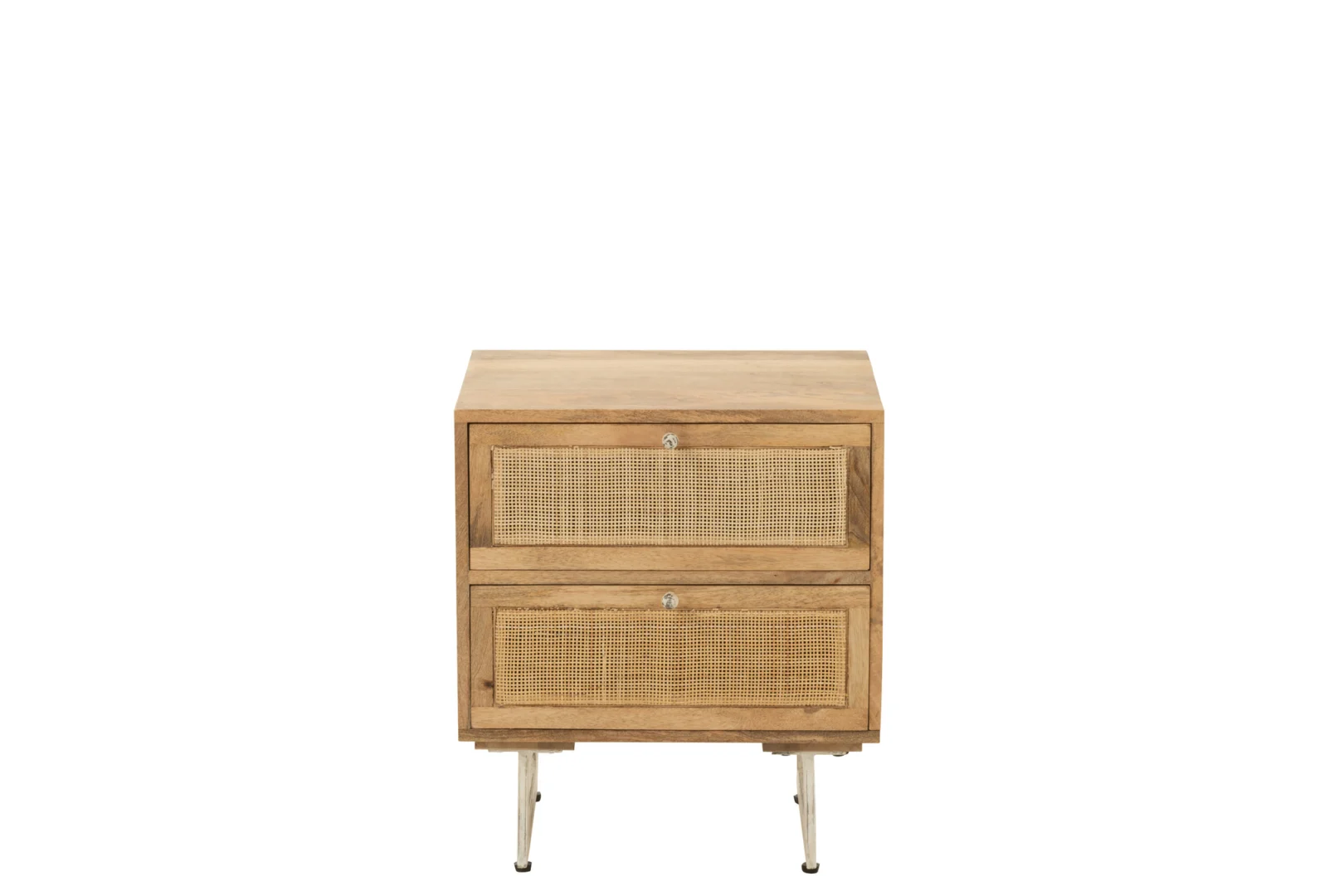Geef je slaapkamer een warme, natuurlijke touch met dit stijlvolle nachtkastje. De naturel tint en het mangohout met subtiele rotan-details zorgen voor sfeer, terwijl het metalen frame jarenlang stevig blijft.