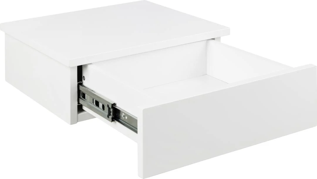 Geef je slaapkamer een frisse, opgeruimde look met dit zwevende nachtkastje in helder wit. Compact en vierkant, het past moeiteloos naast elk bed en houdt je essentials binnen handbereik.