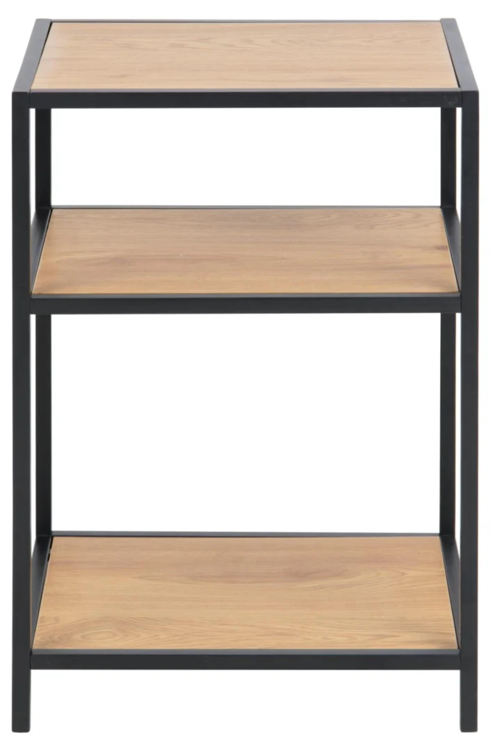 Ontdek een compact nachtkastje in natuurlijke wilde-eiklook met matzwarte stalen poten. MDF-kern, bladdikte 12 mm, twee open vakken van 38,8 bij 31,8 centimeter, draagkracht blad 20 kg/plank 10 kg. Montage neerhalen. Afmeting 63 bij 42 bij 35 centimeter