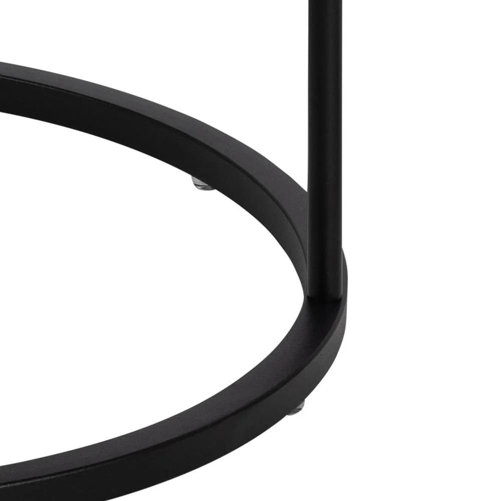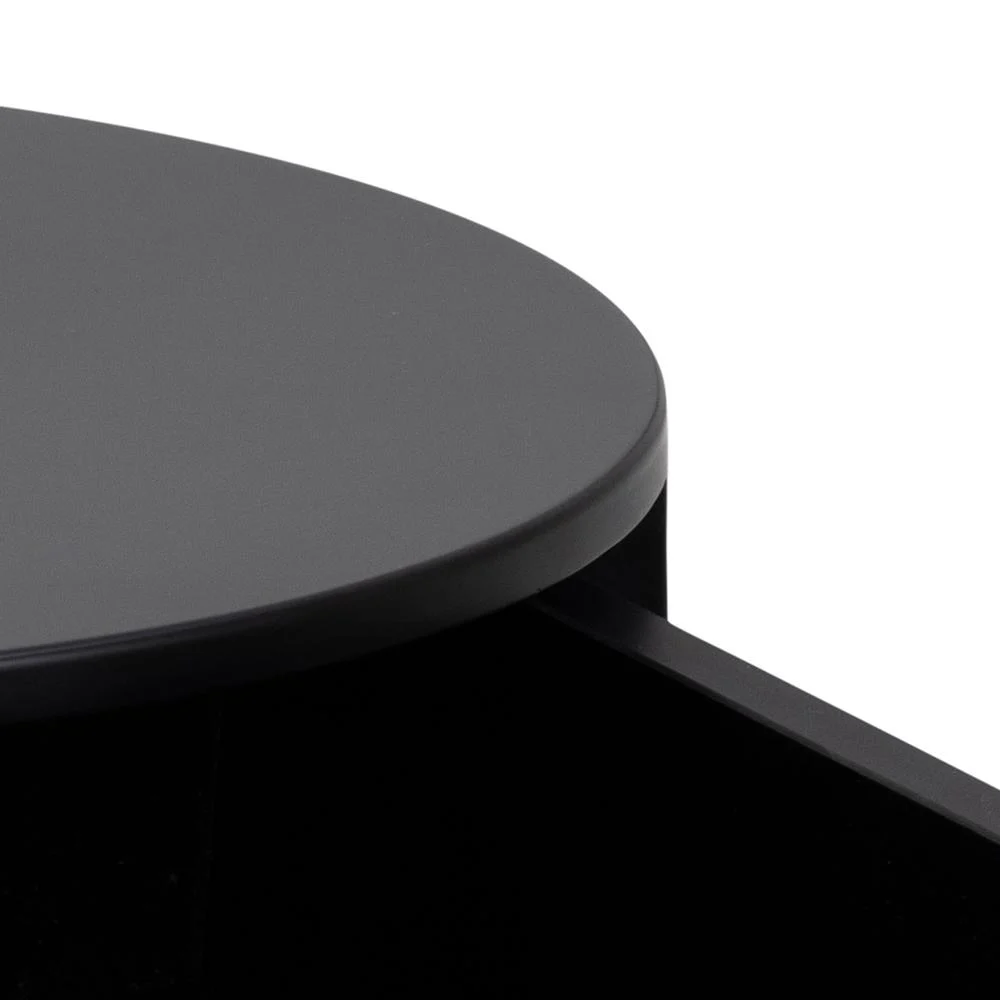 Ontdek een compact, rond nachtkastje van zwart MDF met matzwarte stalen poten. Afmetingen [40] bij [51] centimeter. Met 1 lade (binnenmaat [23] bij [29] bij [10] centimeter), PU-lak, ruw gepoedercoate poten en kunststof voetdoppen; perfect naast bed of bank.