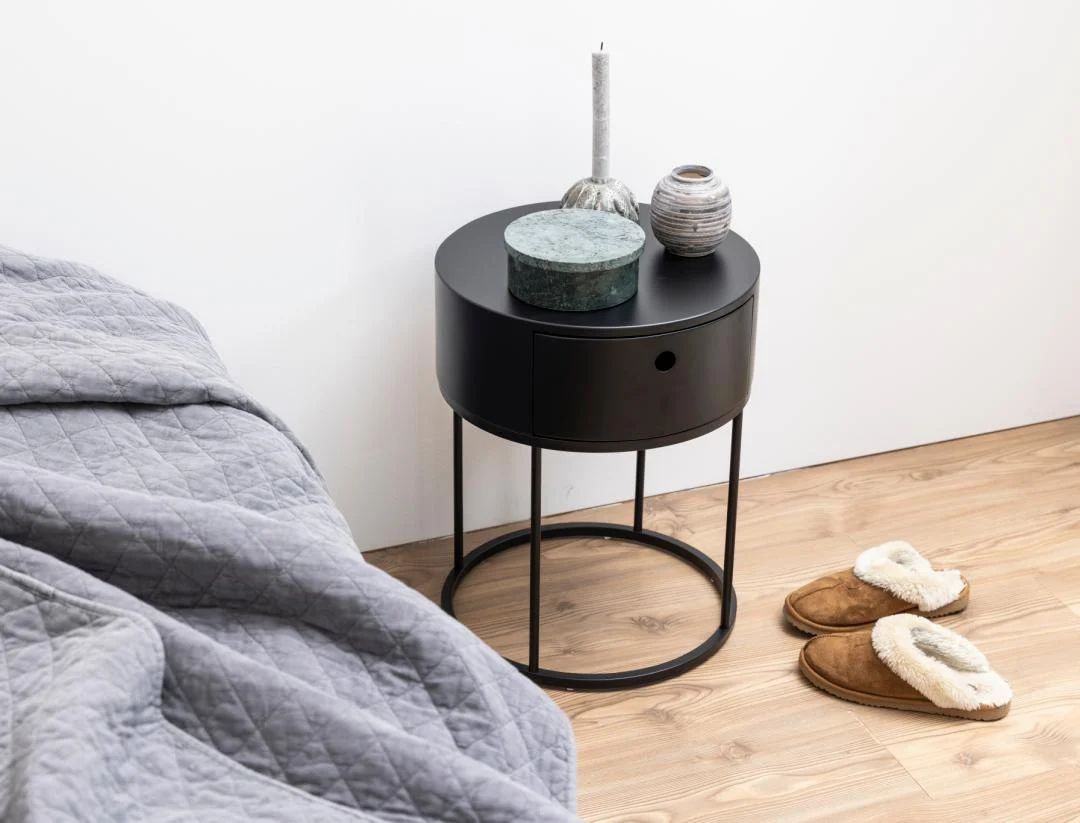 Bewaar bril, boek en oplader binnen handbereik, zonder rommel op je nachtkast. Het zachte, ronde silhouet en de zwarte kleur combineren moeiteloos met moderne en klassieke interieurs. Ook ideaal als compacte bijzettafel in de woonkamer of hal.