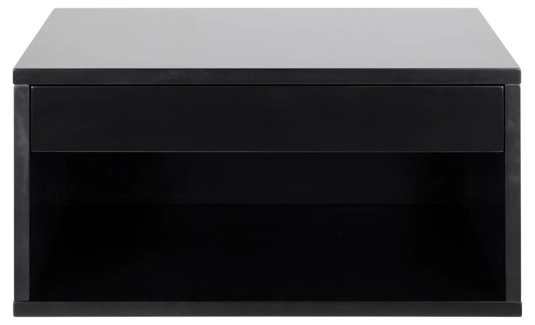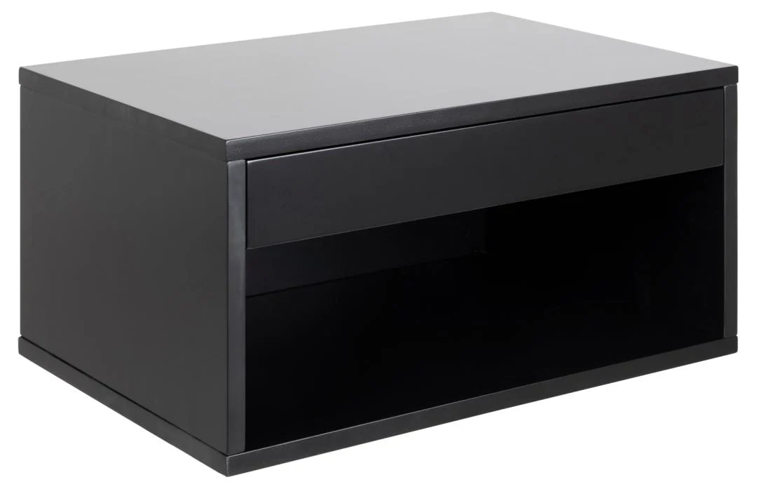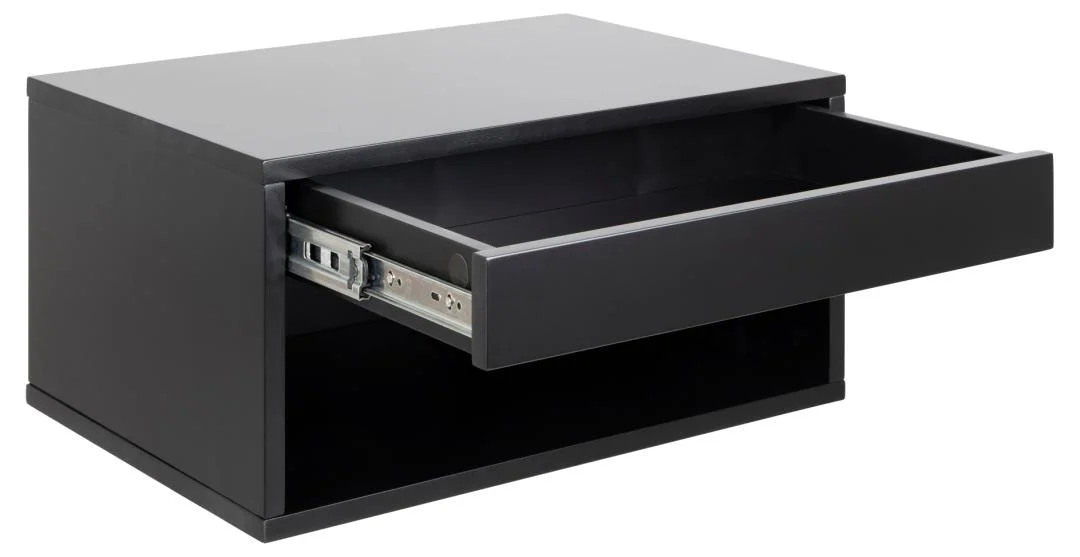 Maak je slaapkamer strak en opgeruimd met dit zwevende nachtkastje in diep zwart. Het ruimtebesparende ontwerp combineert een open vak met een soepel schuivende lade, zodat alles wat je ’s avonds nodig hebt binnen handbereik ligt.