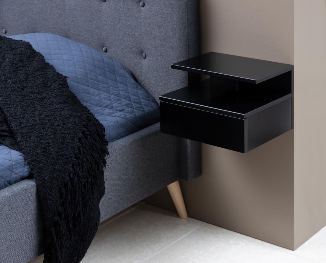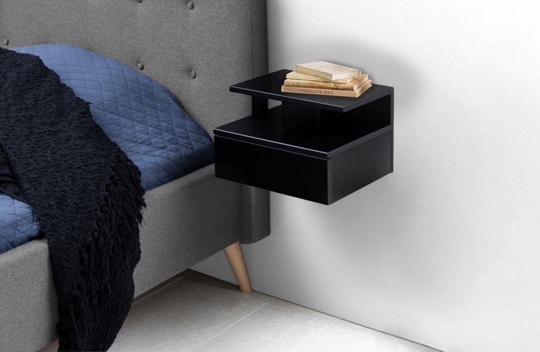 Geef je slaapkamer een rustige, moderne look met dit zwevende nachtkastje in stijlvol zwart. De rechthoekige vorm, een lade en een open vak bieden slim overzicht zonder vloeroppervlak in te nemen dankzij wandmontage.