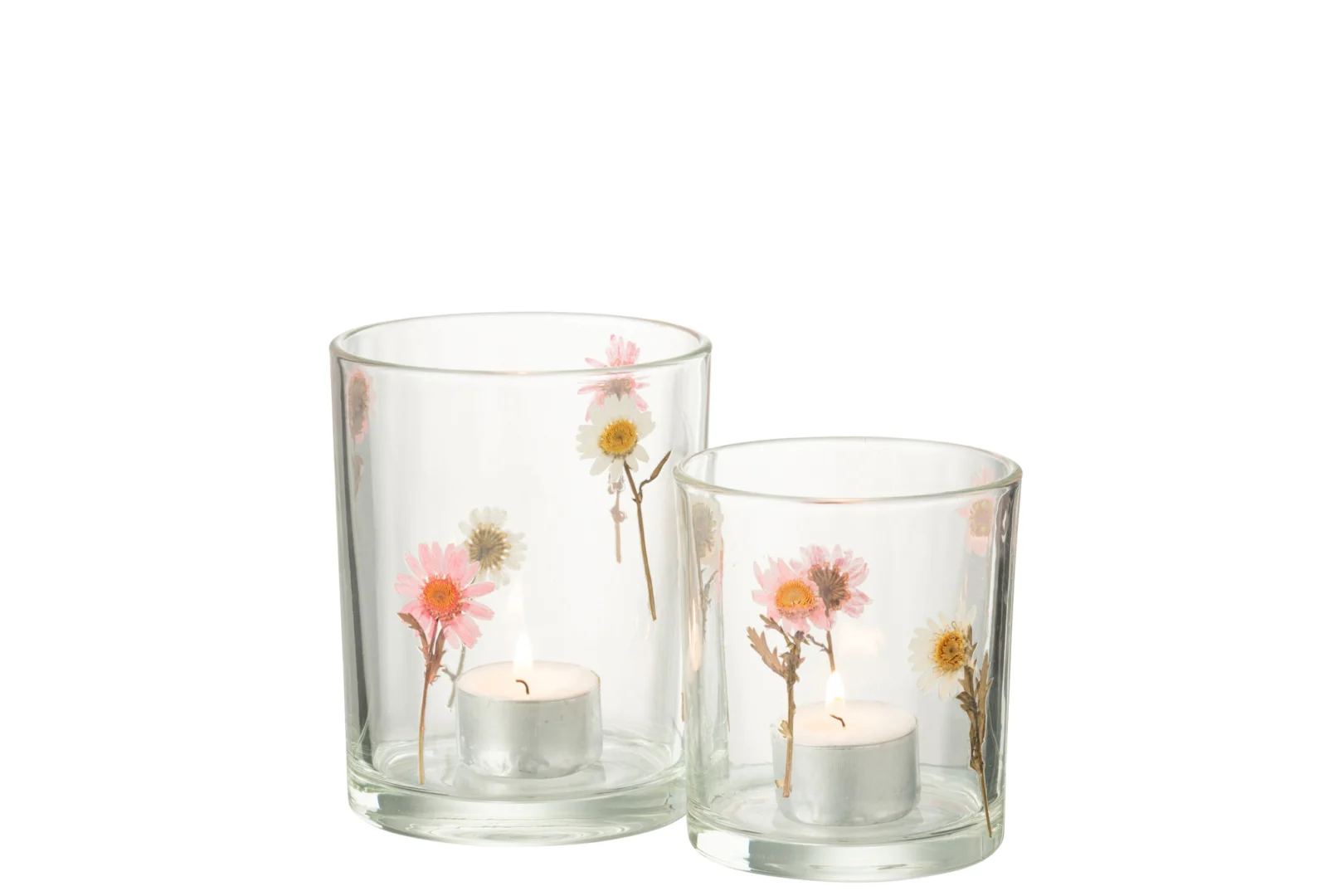 Breng meteen sfeer in huis met dit glazen windlicht van J-Line, versierd met een speels bloemenmotief in een mix van kleuren. De warme gloed maakt elke avond gezelliger, van de eettafel tot de vensterbank.