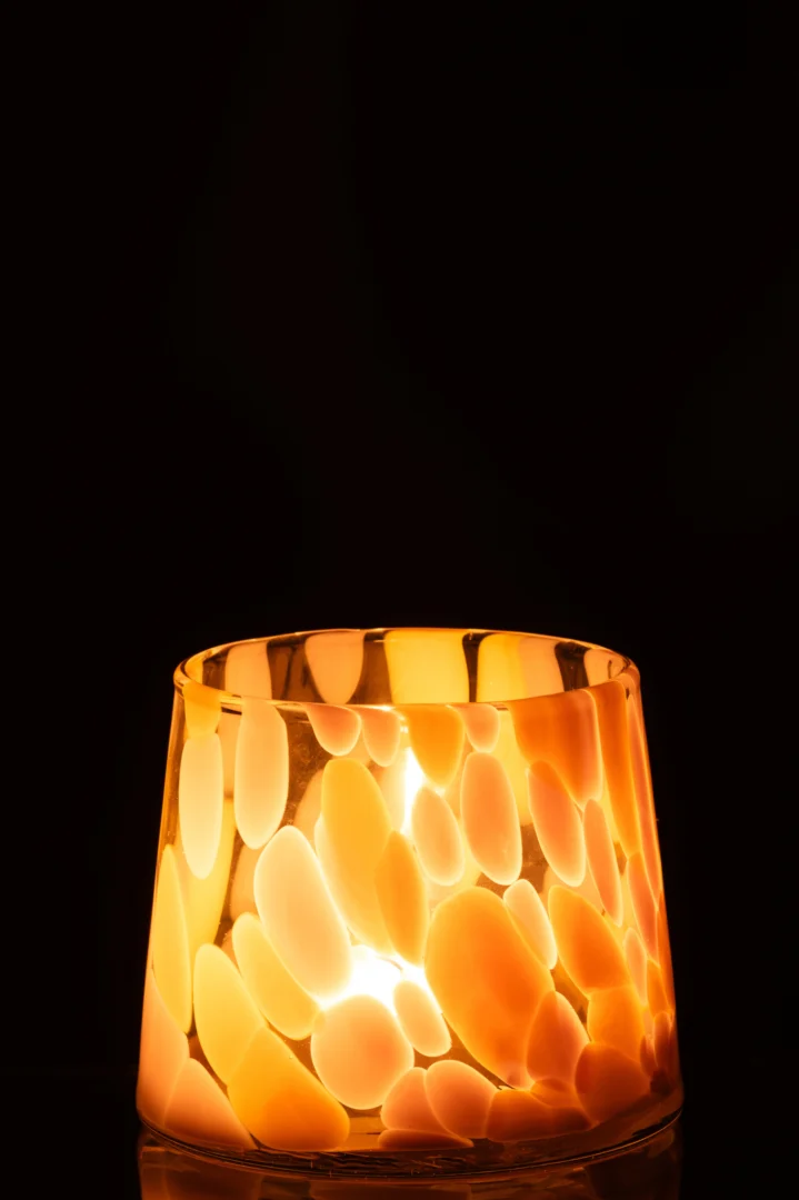 Tijdens een etentje buiten voegde dit kleine glazen windlicht een warme, sfeervolle gloed toe. De roze-oker tint verspreidt het kaarslicht subtiel en het gespikkelde patroon oogt levendig. Door het lichte gewicht is het wat windgevoelig. Ideaal voor liefhebbers van gezellige tafeldecoratie. Een charmante keuze voor intieme settings.