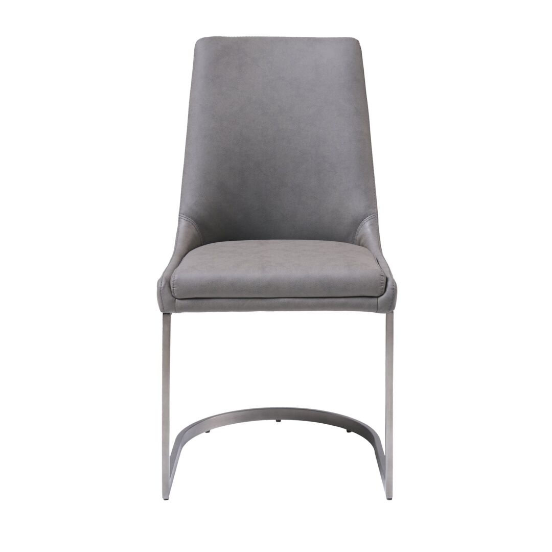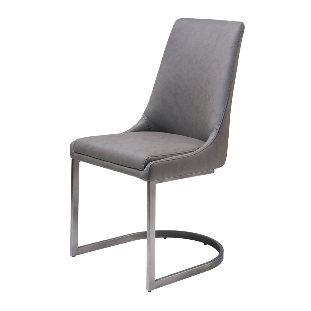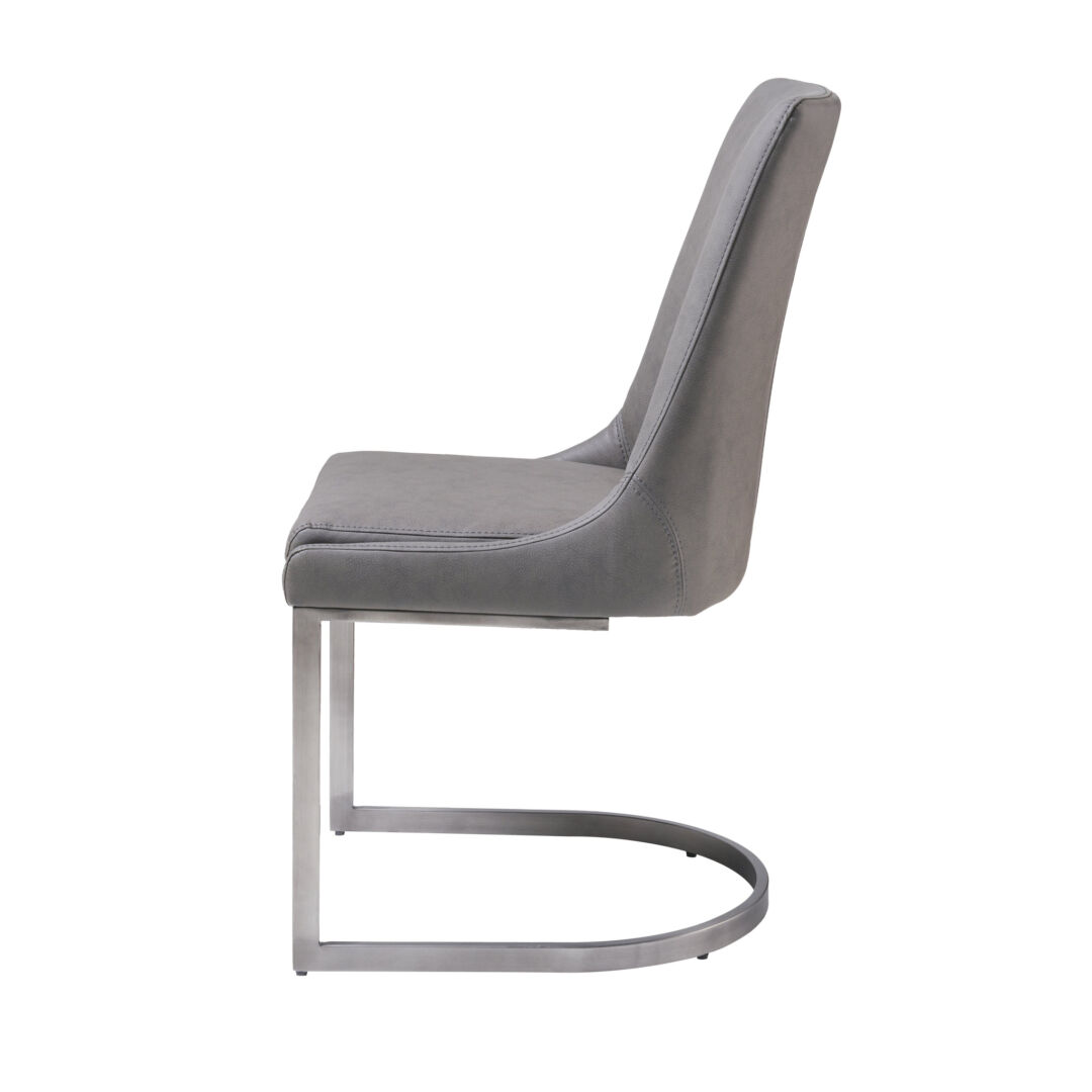 Deze eetkamerstoel in basaltgrijs oogt modern én tijdloos. De beklede schaal rust op een verzwaarde roestvrijstalen basis; slank, stevig en makkelijk te schuiven als armloze bijstoel bij elke tafel.