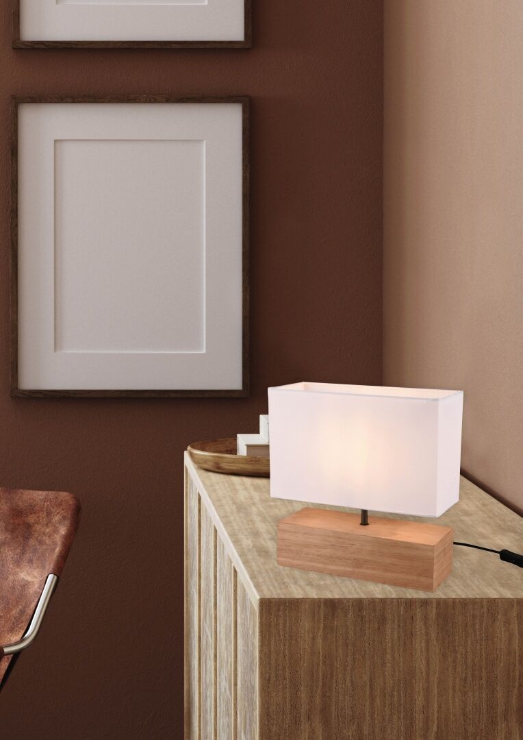 A: De tafellamp heeft afmetingen van 30,0 x 12,0 x 30,5 cm (L x B x H) en combineert een armatuur van natuurlijk hout met een witte textielen lampenkap voor een warme, moderne uitstraling die in diverse interieurstijlen past.