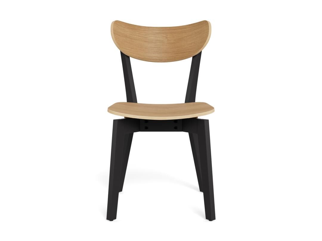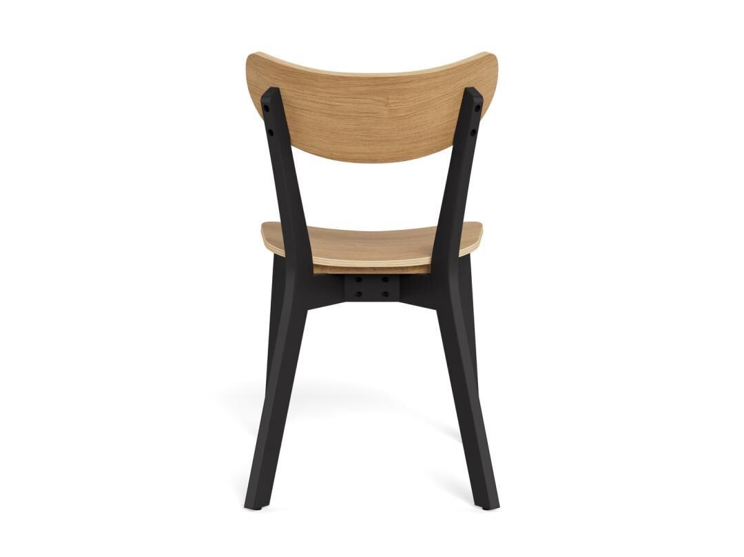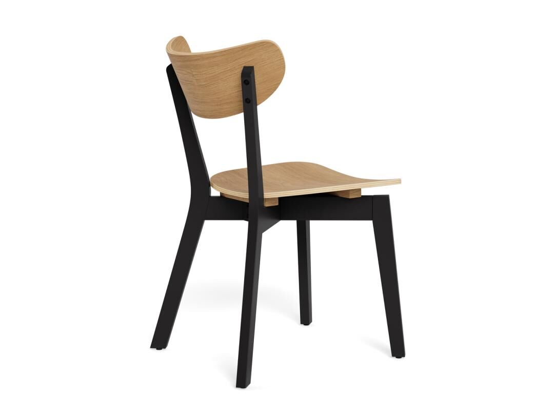 Eetkamerstoel met tijdloze mix van retro en modern. Zitting in eikenfineer (acrylgelakt) in naturel, stevige poten van matzwart rubberhout met viltjes. Demontabel, stabiel op 4 taps toelopende poten, draagkracht 110 kg. Comfortabele zit: 42,5 cm hoog, 41,5 cm breed, 37,5 cm diep. Maak je eethoek af.