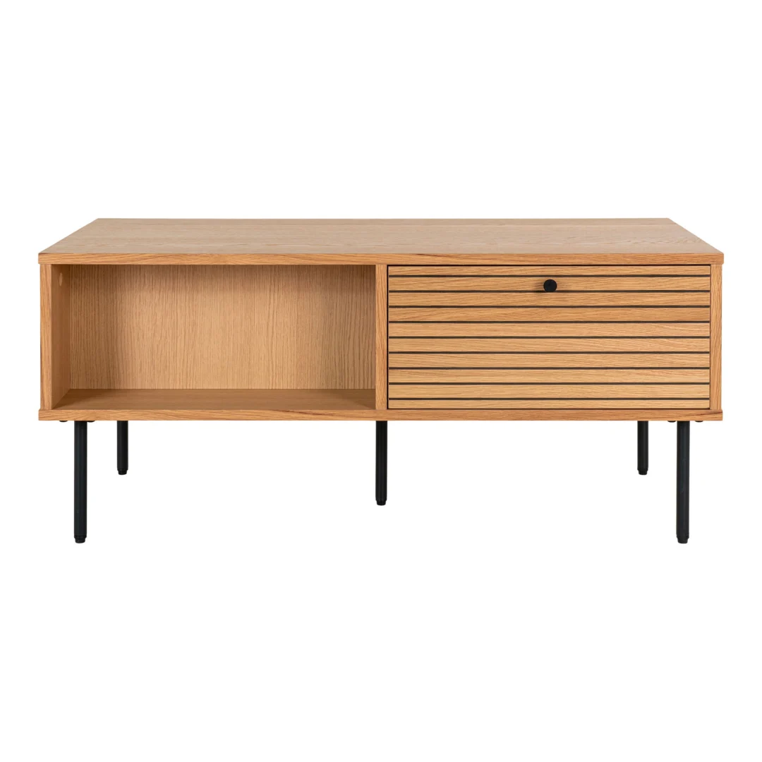 Geef je woonkamer een warme upgrade met deze stijlvolle salontafel in eikenhout-kleur. Dankzij de doordachte afmetingen past hij moeiteloos voor de bank en biedt hij precies genoeg plek voor alles wat je bij de hand wilt hebben.