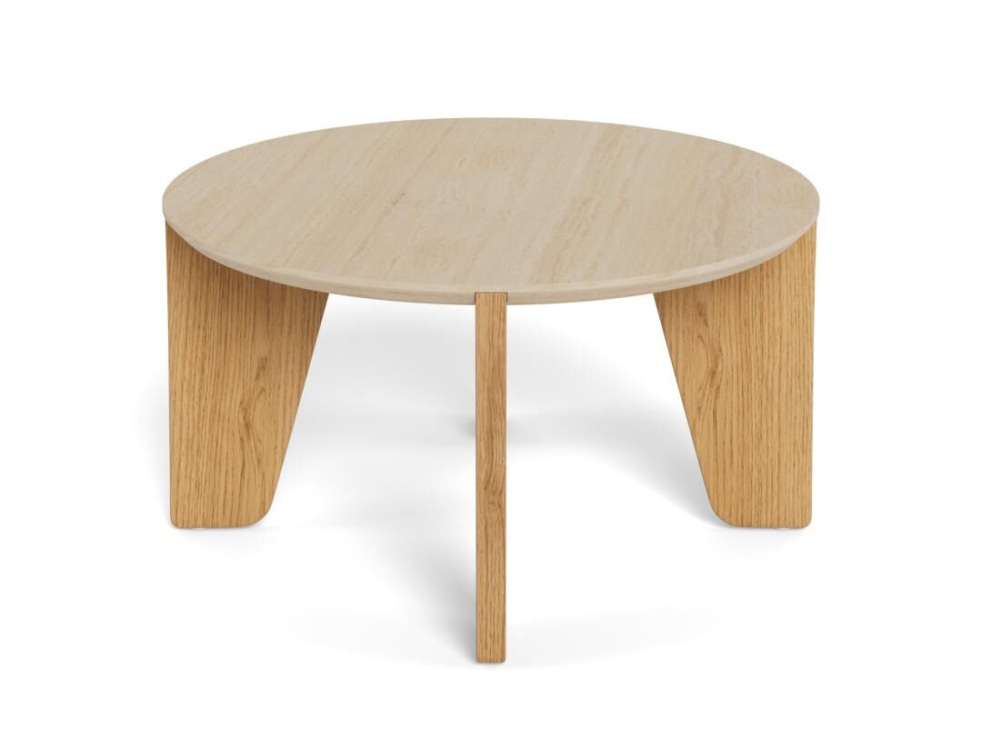 Geef je woonkamer een warme, natuurlijke uitstraling met deze ronde salontafel. Het beige blad met travertijn-look en de matte “wilde eik” poten vormen een stijlvolle combinatie die moeiteloos past in moderne en Scandinavische interieurs.