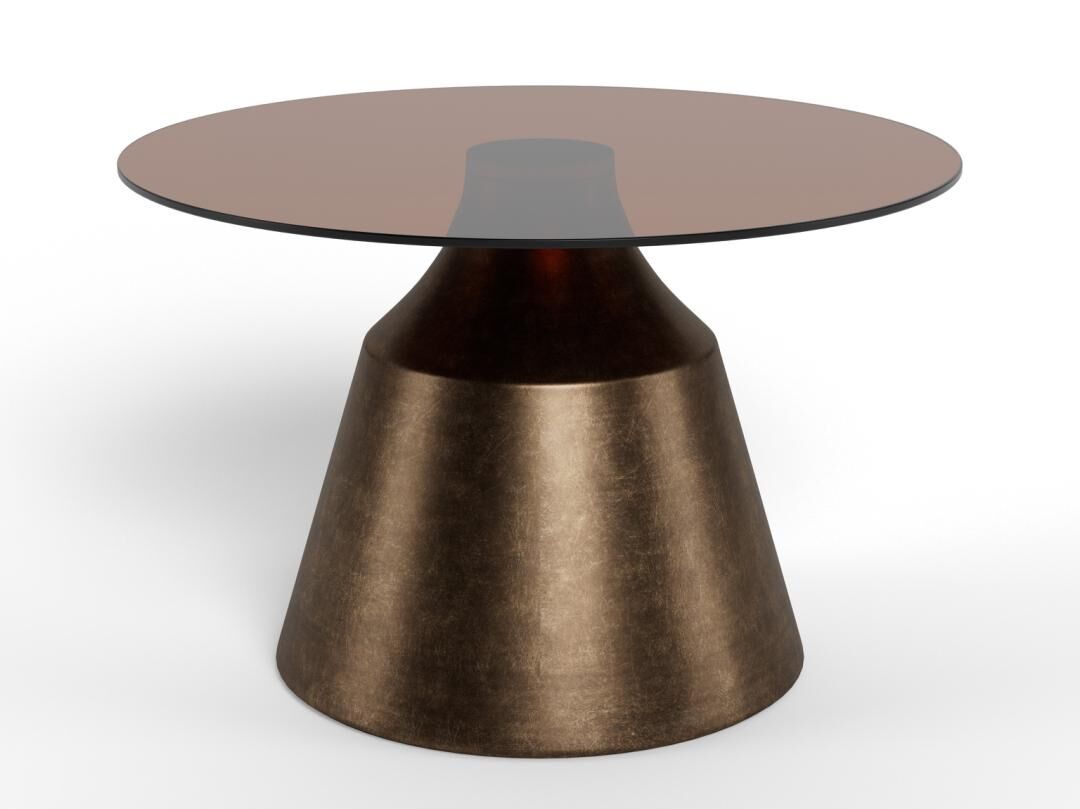 Stijlvolle salontafel met rond gehard glazen blad (Ø45, 8 mm) in warm bruin en een geborstelde, subtiel vergulde bronzen zuilvoet van staal. Compact (H47), sterk tot 20 kg. Viltpads beschermen je vloer. Gedeeltelijke montage. Perfect voor koffie, boeken of een vaas. Voeg stijl toe aan je interieur.