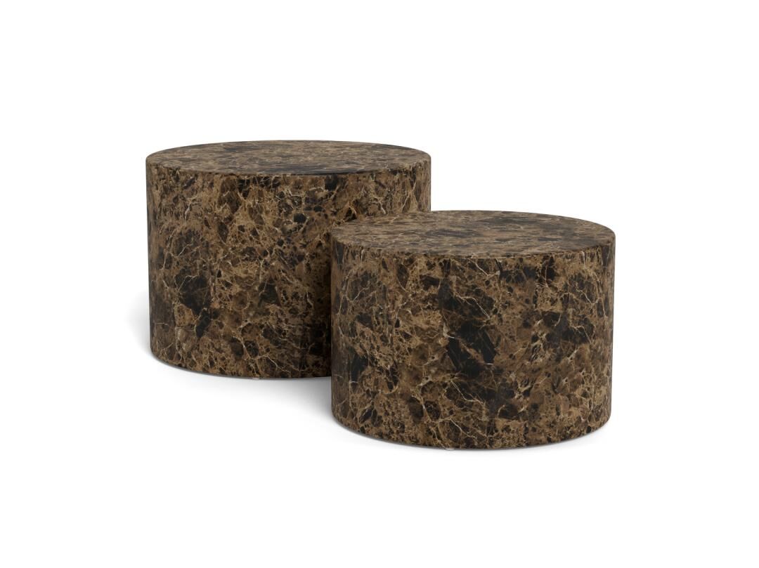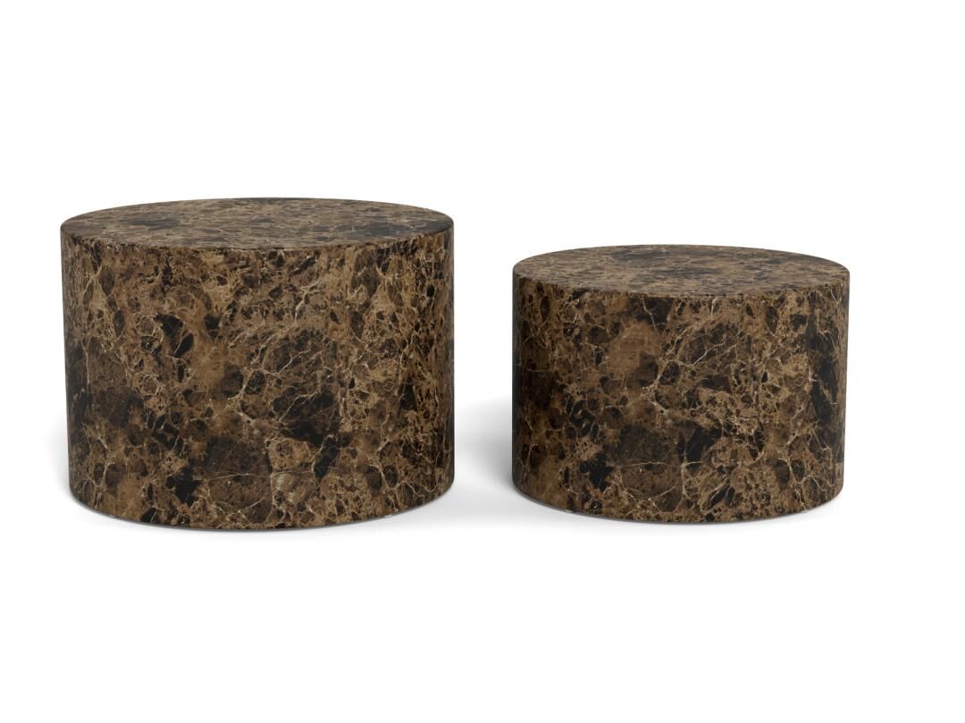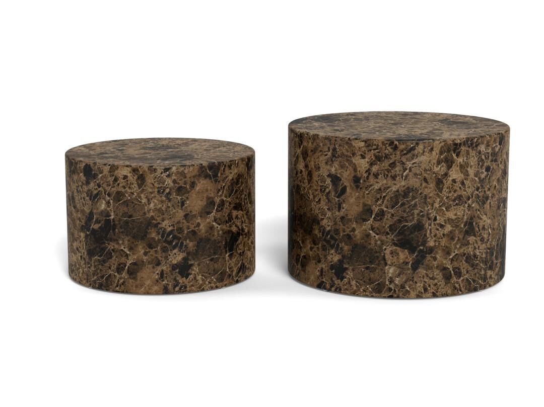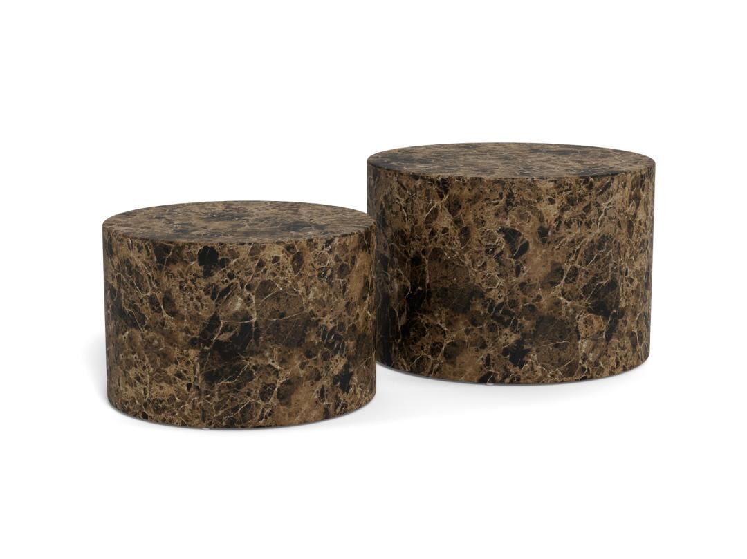 Geef je woonkamer een warme upgrade met deze ronde salontafelset in stijlvolle bruine marmerlook. De twee tafels vormen een speels duo dat je naar wens kunt overlappen of apart gebruiken.