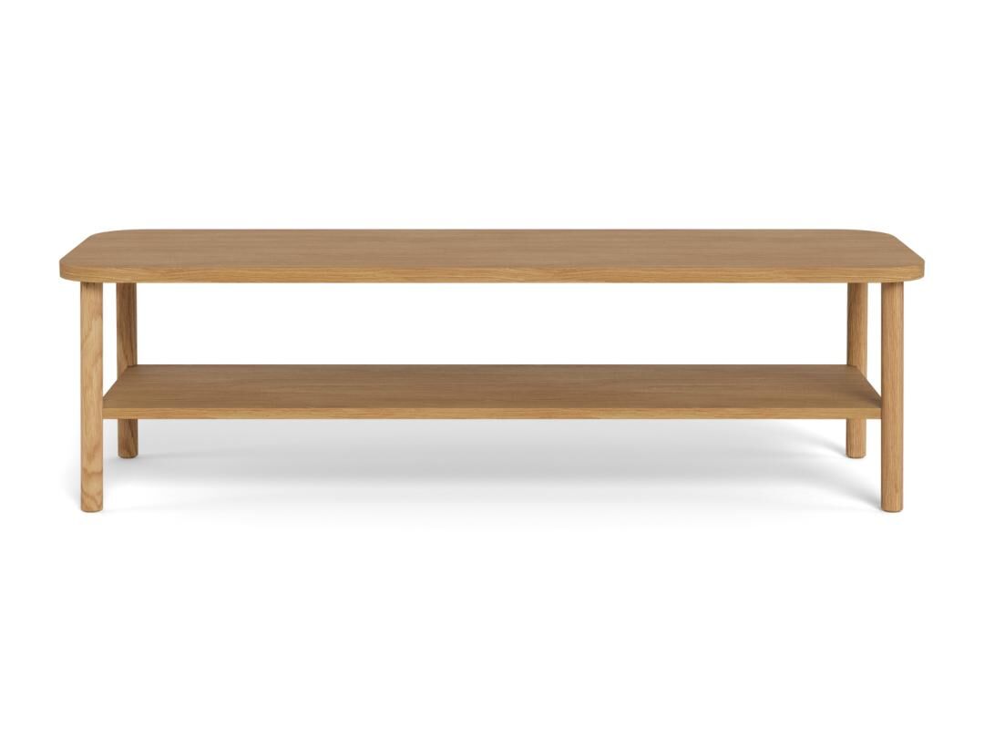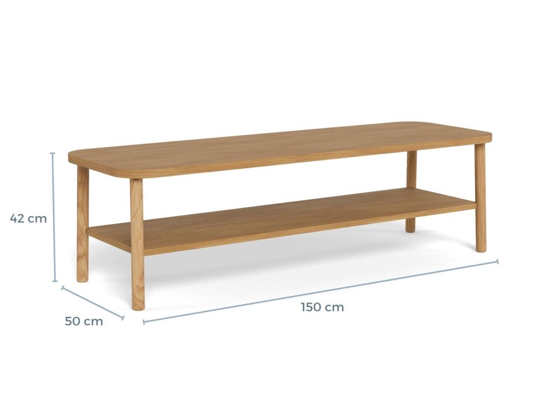 Strakke rechthoekige salontafel in natuurlijk eiken. PU-gelakt eikenfineerblad en extra legplank (134×34 cm) voor opbergen. Stevig: 4 ronde NC-gelakte eiken poten met plastic voetdoppen. Draagvermogen: blad 20 kg, plank 20 kg. Afm. 150x50x42 cm. Makkelijk te monteren.