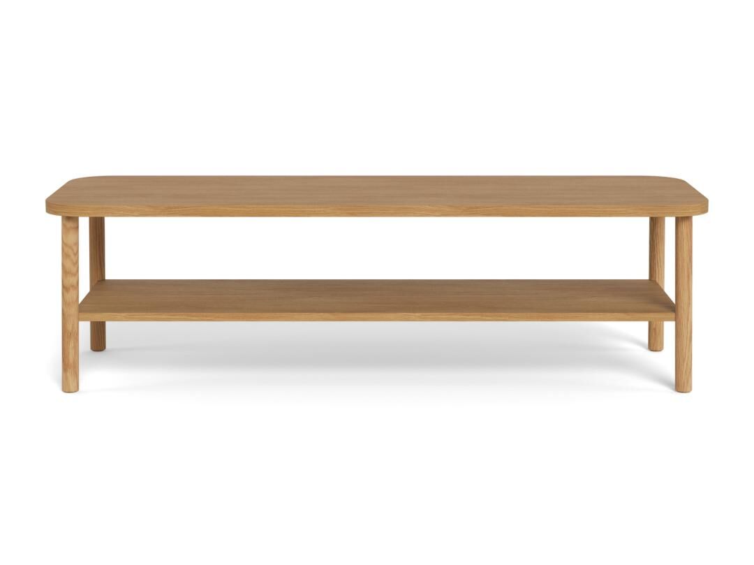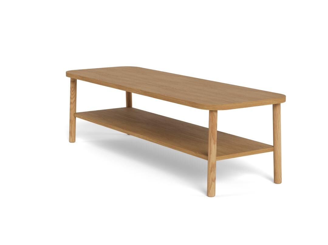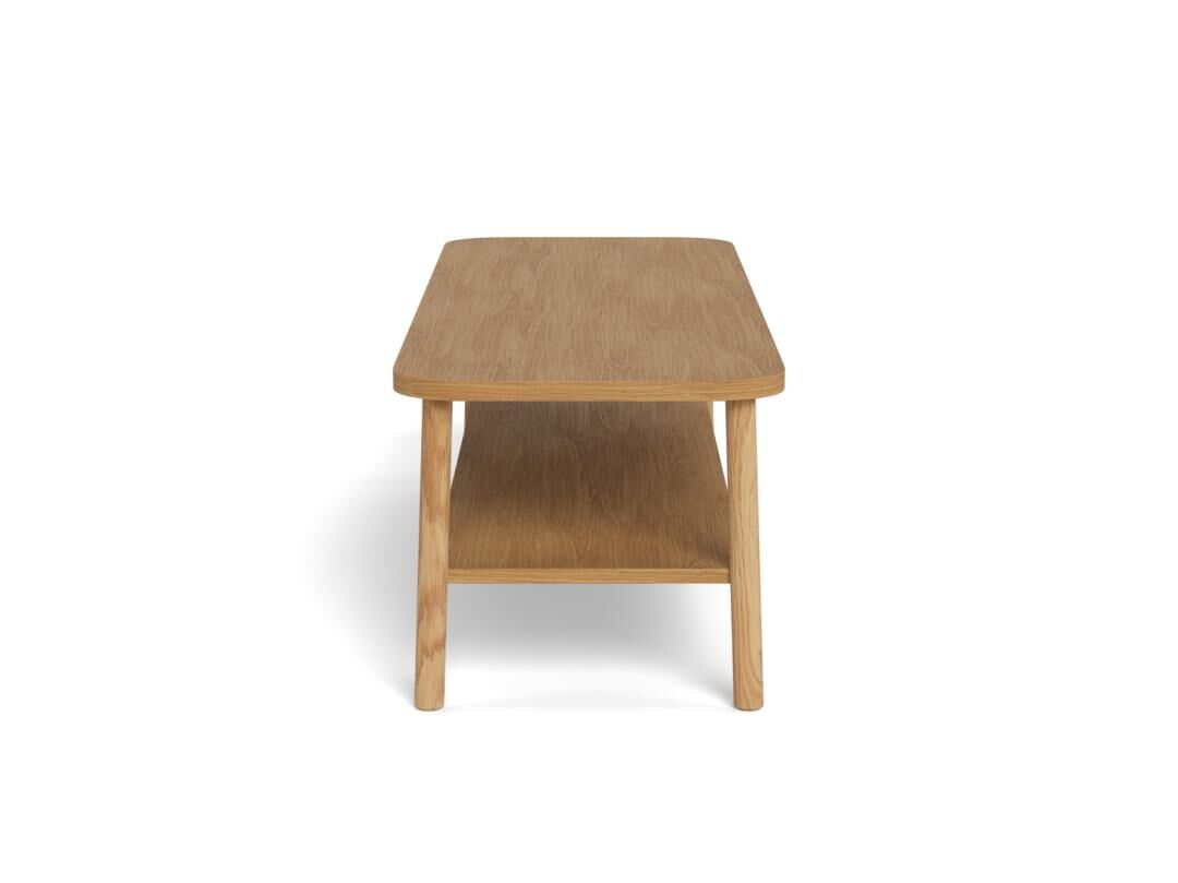 Tijdens een avondje met vrienden biedt deze salontafel voldoende ruimte voor drankjes en hapjes. Het eikenfineer oogt natuurlijk en strak, en de extra legplank is praktisch. Minder geschikt voor kleinere woonkamers. Ideaal voor liefhebbers van een sobere, warme stijl.