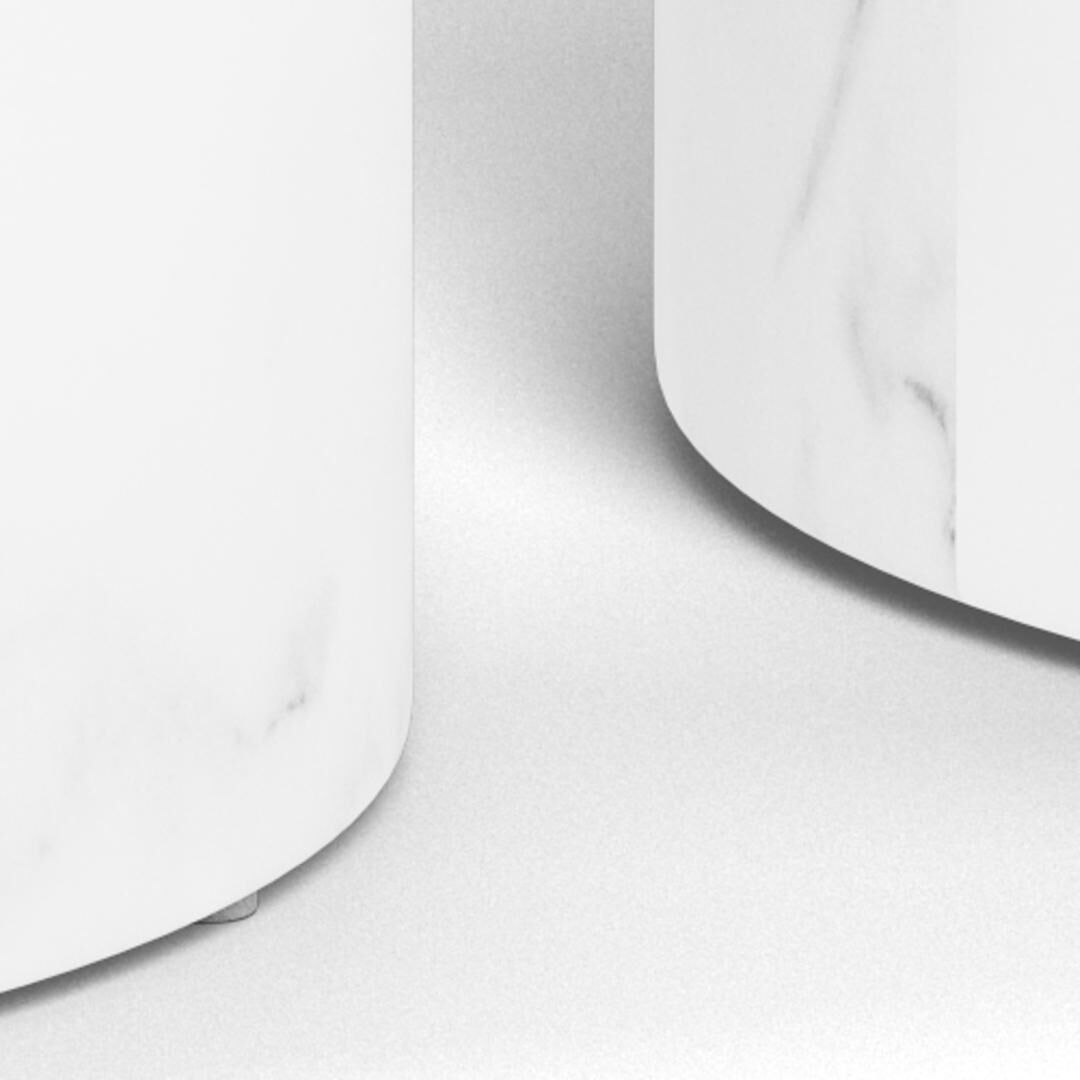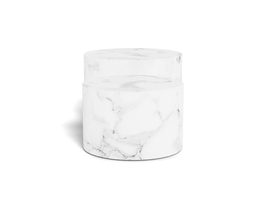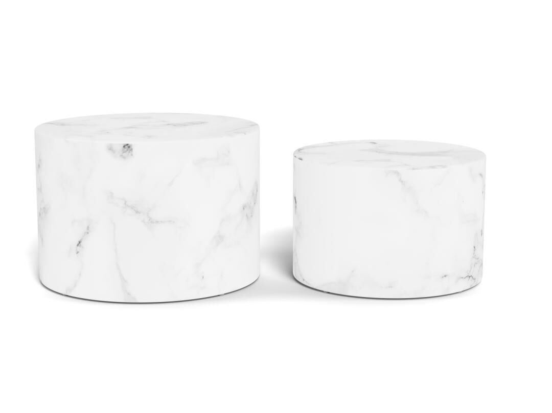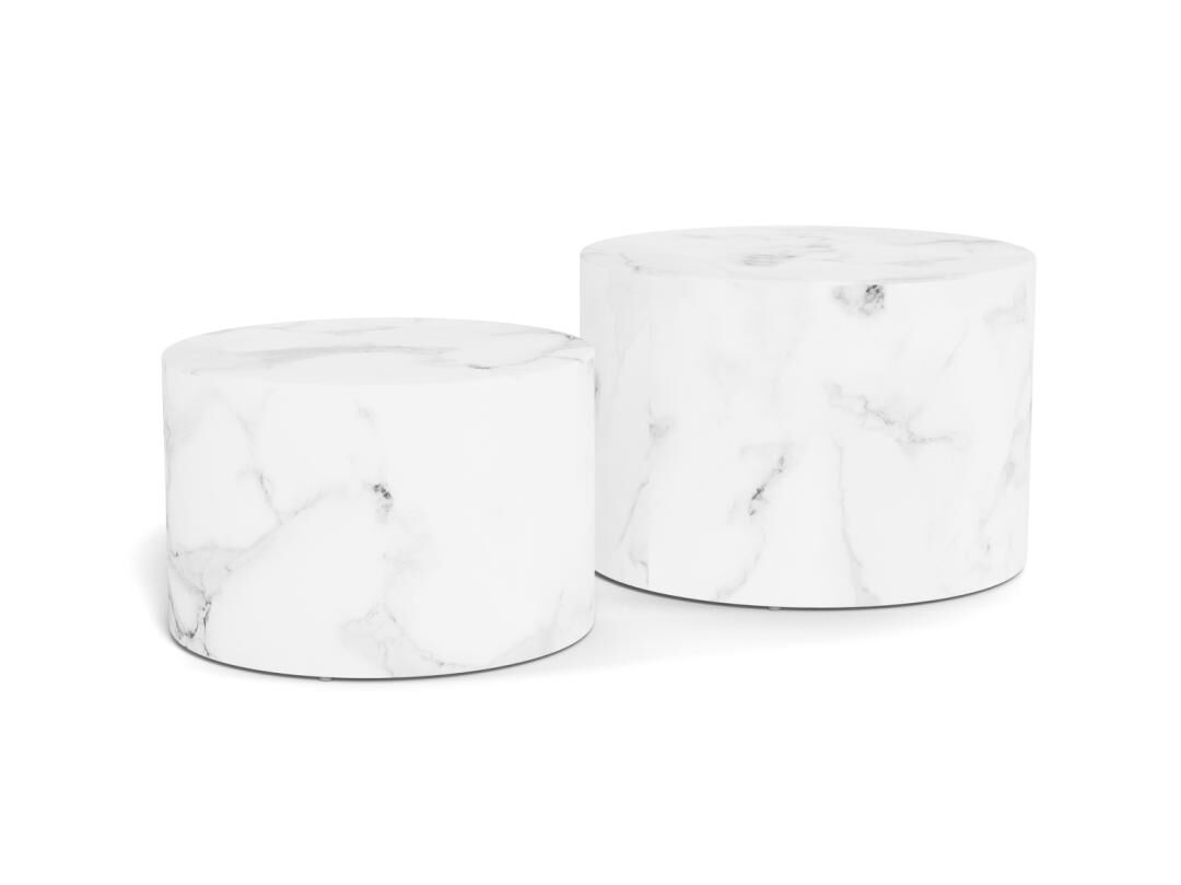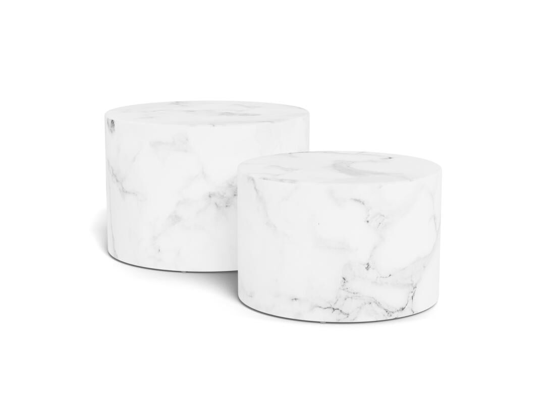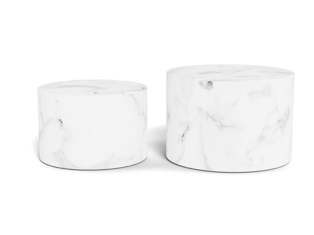 Breng stijl in je woonkamer met deze set van twee ronde tafels in wit Carrara-marmerlook. Dankzij de verschillende hoogtes en diameters gebruik je ze flexibel, samen of los.