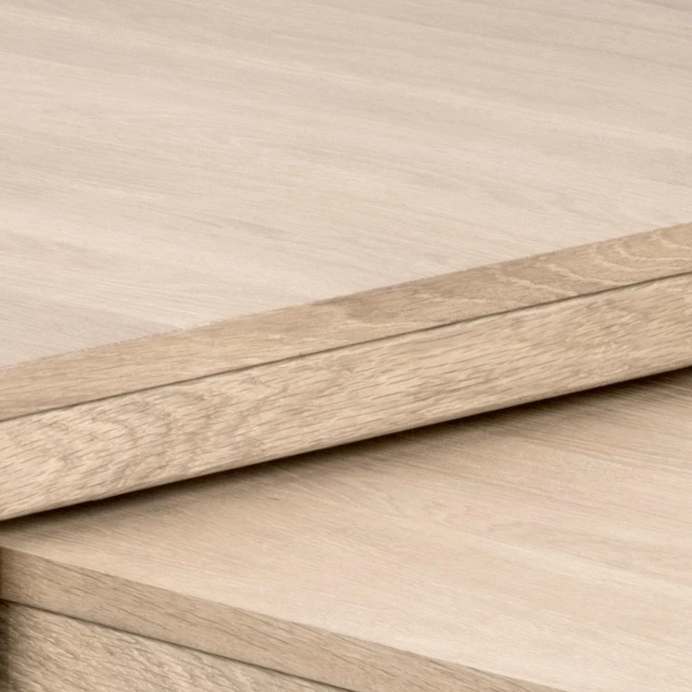 Tafelbladen met PB-spaanplaat kern en eikenfineer, geolied voor natuurlijke bescherming; poten in wit gepigmenteerd eiken. Reinigen met een zachte, licht vochtige doek; gebruik onderzetters en onderhoud het hout af en toe met geschikte olie.