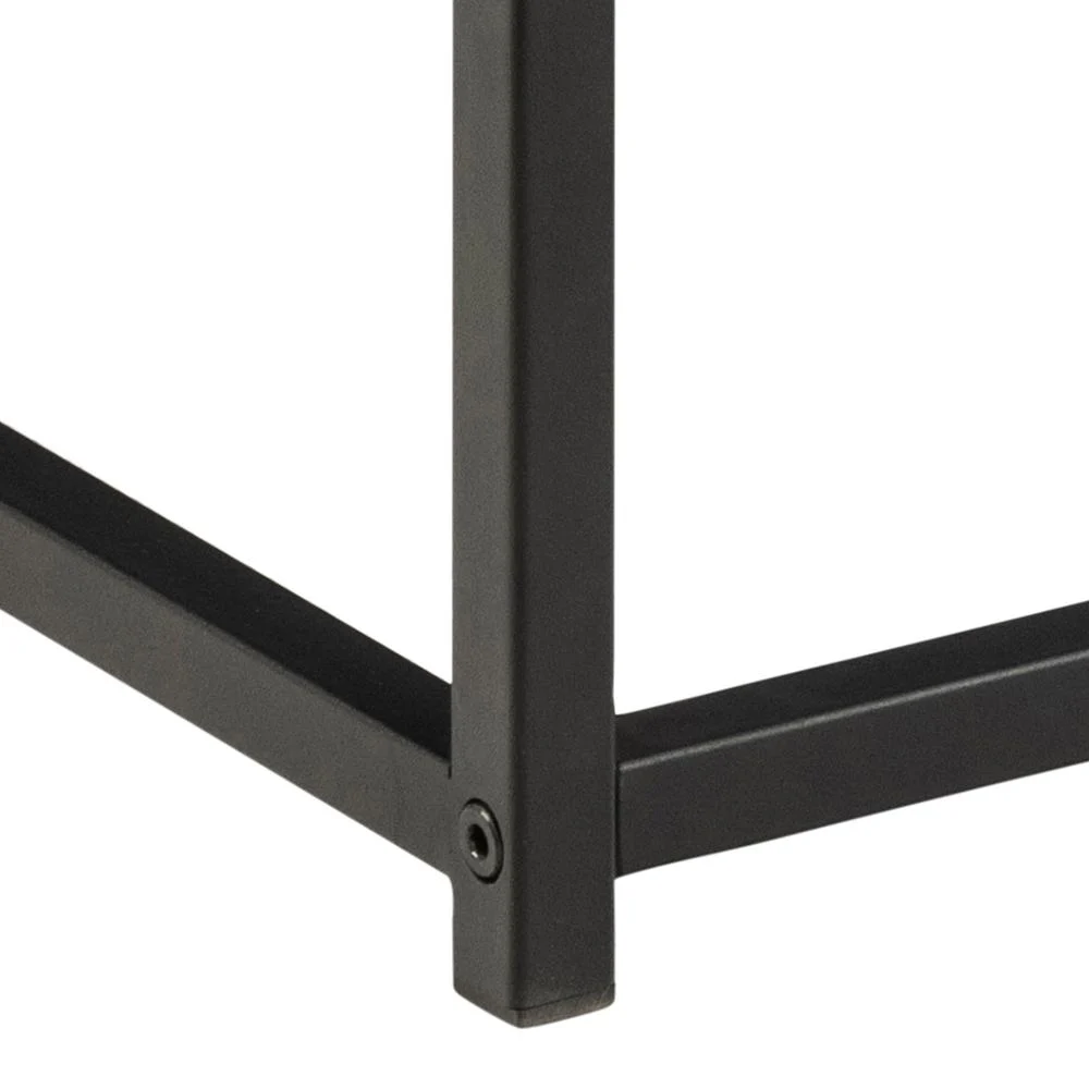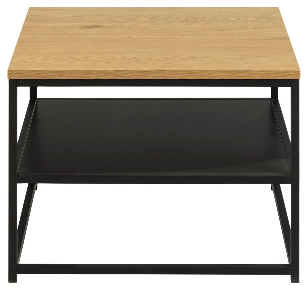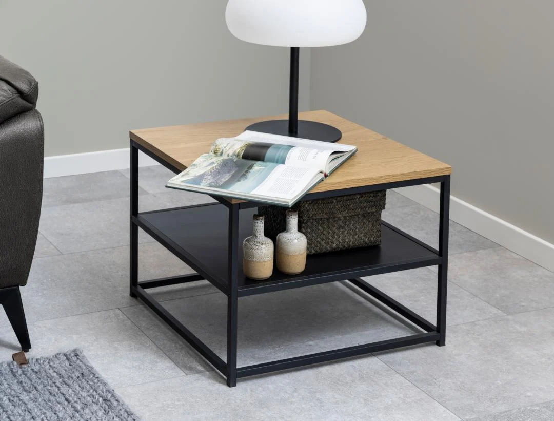 Deze compacte salontafel brengt warme houtlook en stoere accenten samen. De vierkante vorm past perfect in moderne en knusse woonkamers, en biedt slimme opbergruimte zonder te overheersen.